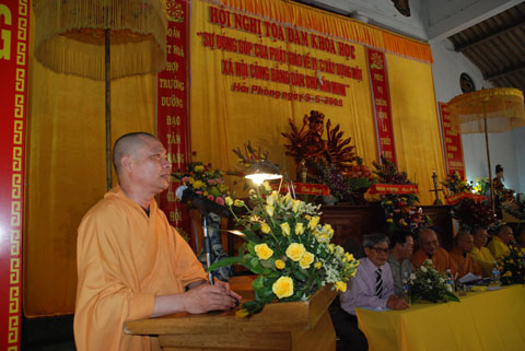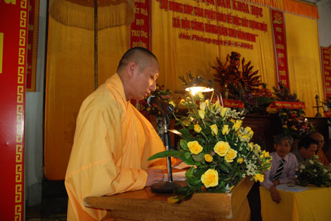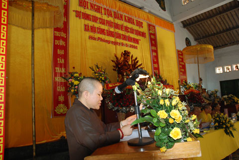 Thích Thanh Giác – UV HĐTS TW GHPGVN – Phó trưởng BTS Thành hội PG Hải Phòng phát biểu cảm ơn các vị lãnh đạo Ban dân vận TW , Viện khoa học xã hội Việt Nam, Viện nghiên cứu tôn giáo, chư tôn đức Tăng Ni, các học giả các nhà nghiên cứu