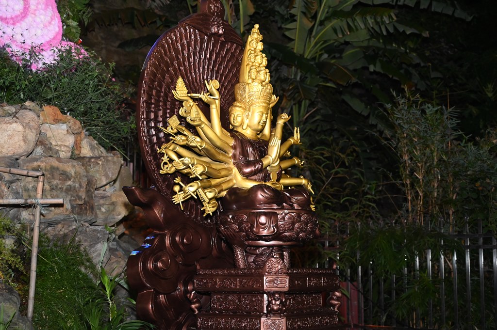 Tôn tượng Đức Bản Sư Thích Ca Mâu Ni Phật và Bồ Tát Quán Thế Âm Thiên Thủ Thiên Nhãn bằng đồng sau khi được an vị tại khuôn viên chùa Tiên Đồng
