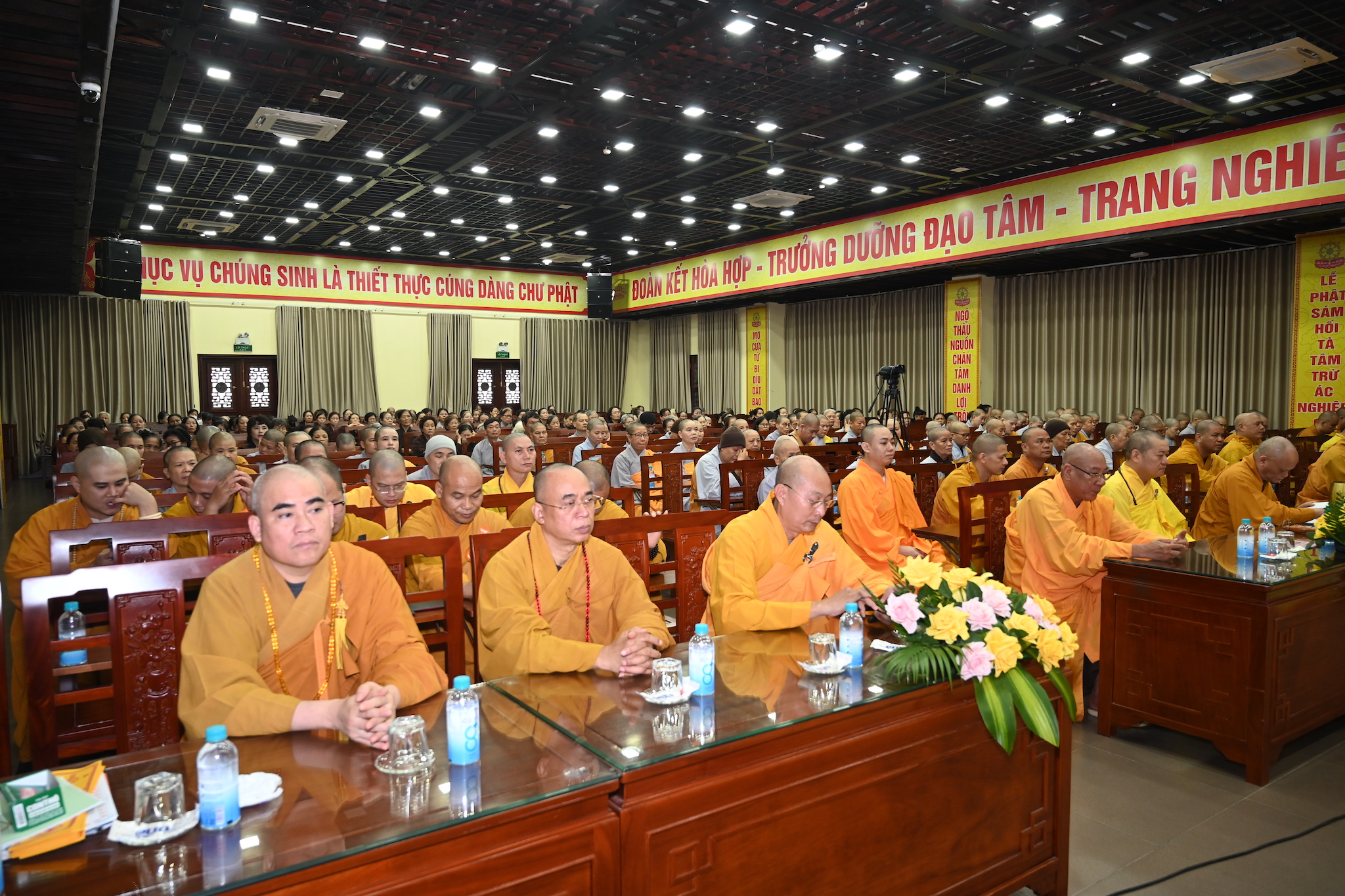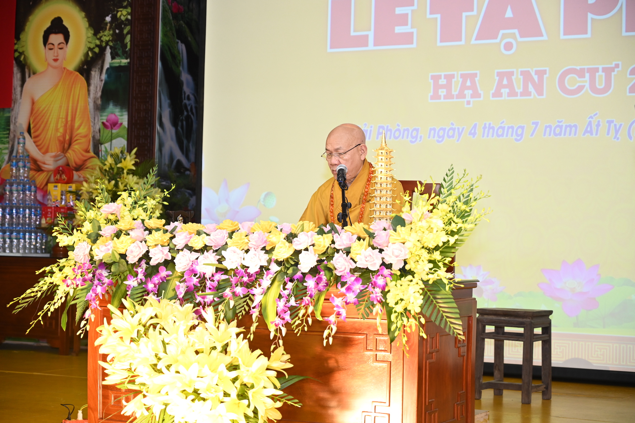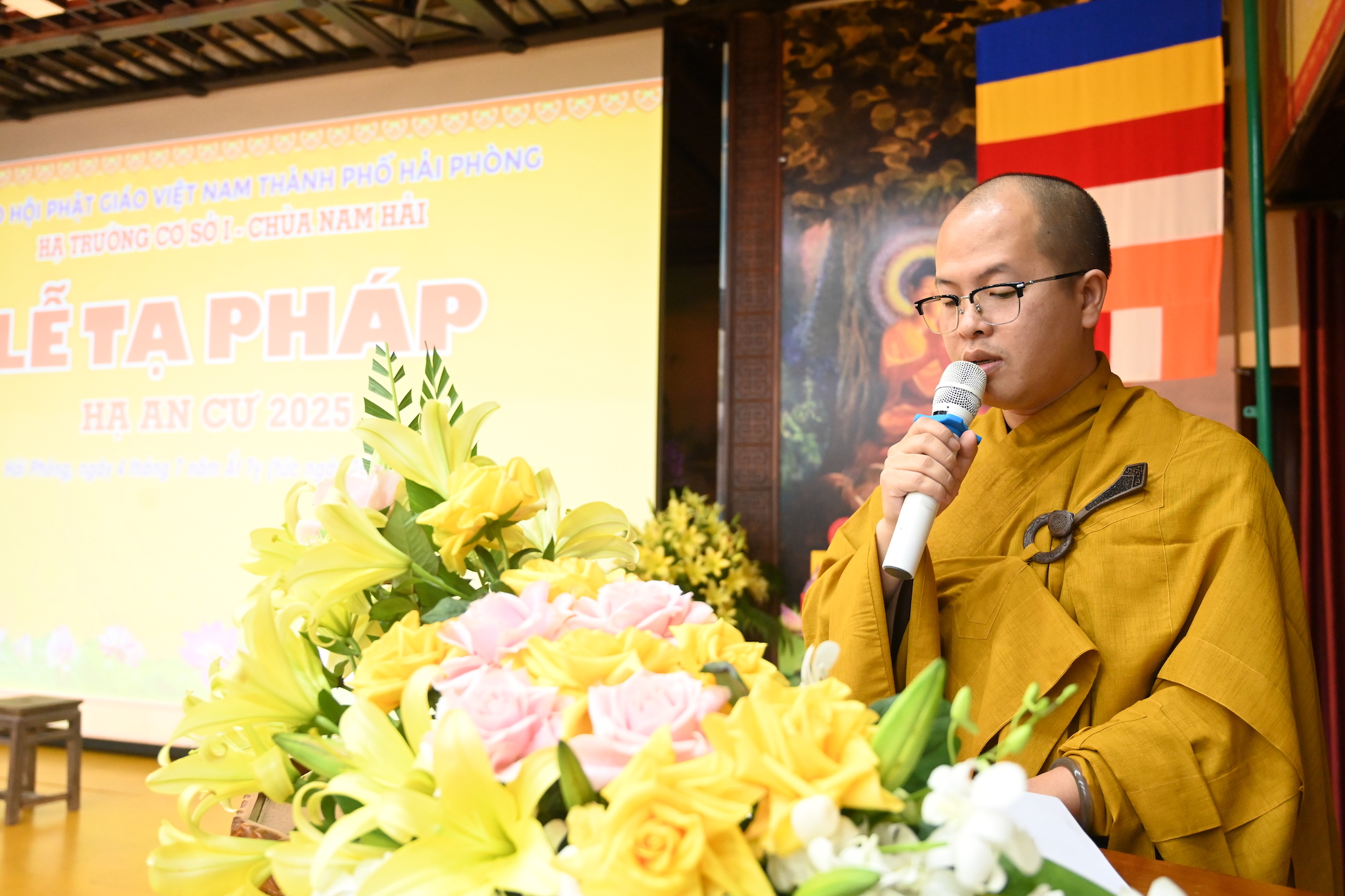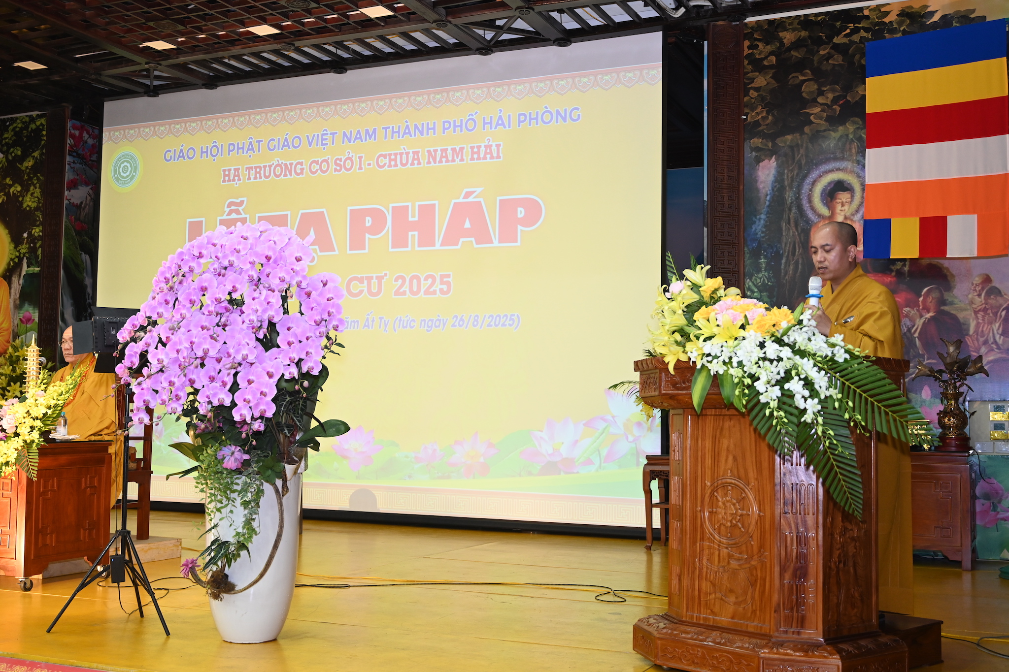Sau nghi thức niệm Phật cầu gia bị, Đại đức Thích Bản Chân, đại diện cho Ban Thư ký hạ trường đã lên Báo cáo tổng kết công tác an cư kiết hạ PL. 2569 – DL. 2025. Theo báo cáo, tại trường hạ chùa Nam Hải, trường hạ cơ sở 1 của thành phố Hải Phòng có tổng số 199 hành giả thực hiện cấm túc an cư (Trong đó có 55 vị Tỷ Khiêu và 144 vị Tỷ khiêu Ni). Chư tôn đức đã thực hiện nghiêm túc thời khóa tu học, cụ thể mỗi ngày có 3 thời khóa sáng, trưa , chiều tối và 2 thời cảnh sách, niệm Phật. Thực hiện đầy đủ khóa Sám nguyện Tịnh độ vào 4 ngày trai và 2 kỳ Bá tát hàng tháng. Thực hiện chỉ đạo của Ban tổ chức khóa an cư kiết hạ, chư tôn đức an cư tại các trường hạ trong thành phố nghiên cứu kinh Địa Tạng Bồ Tát Bản Nguyện và Giới luật đại cương, do Hòa thượng đường chủ hạ trường thuyết giảng và chia sẻ. Trong các buổi giảng pháp, hầu hết chư hành giả an cư đều tham gia nghe giảng rất đầy đủ và nghiêm túc. Đặc biệt, các buổi thuyết giảng đều được Ban truyền thông của hạ trường phát trực tiếp trên các nền tảng mạng xã hội để đại chúng được hưởng thêm phần lợi lạc.