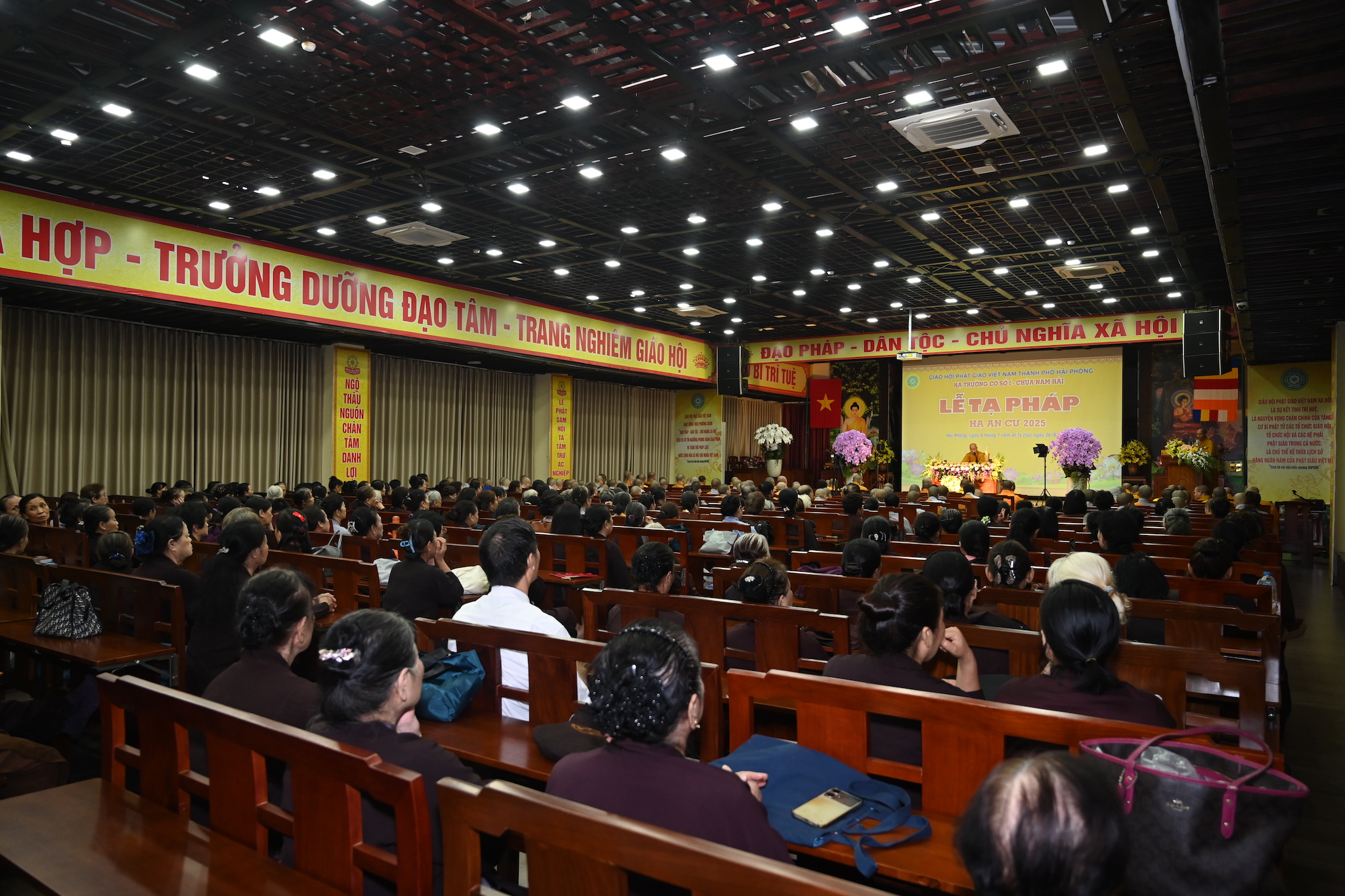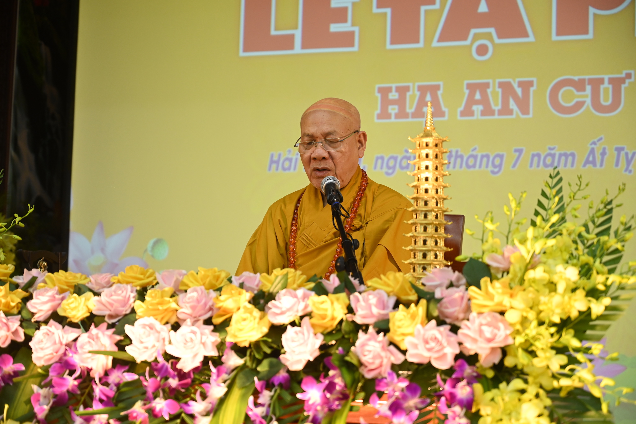 Ban đạo từ tại buổi lễ, Hòa thượng Thích Quảng Tùng đã tán thán công đức của chư hành giả an cư đã nghiêm chỉnh chấp hành nội quy, thời khóa tu học mà Ban tổ chức và ban chỉ đạo công tác an cư đã đề ra. Đồng thời, tán thán công đức của các Phật tử đã phát tâm ngoại hộ Tam Bảo, cúng dàng tứ sự trong suốt 3 tháng an cư kiết hạ. Hòa thượng chúc mừng chư tôn đức sắp thành tựu viên mãn 3 tháng cấm túc an cư, thêm 1 tuổi đạo và mong sau khi trở về trụ xứ, chư tôn đức Tăng Ni tiếp tục nỗ lực phấn đấu, tinh tấn tu học, dành thời gian nghiên cứu kinh điển, trau dồi giới đức, từ đó dấn thân nhập thế, mang hết sức lực và tâm huyết của mình để hoằng dương chính pháp, làm lợi lạc quần sinh. Nhân đây, Hòa thượng Đường chủ hạ trường cũng gửi lời tri ân các cấp chính quyền thành phố, chính quyền địa phương sở tại đã tạo mọi điều kiện giúp đỡ chư tôn đức Tăng Ni trong thời gian thực hiện cấm túc an cư tại trường hạ.