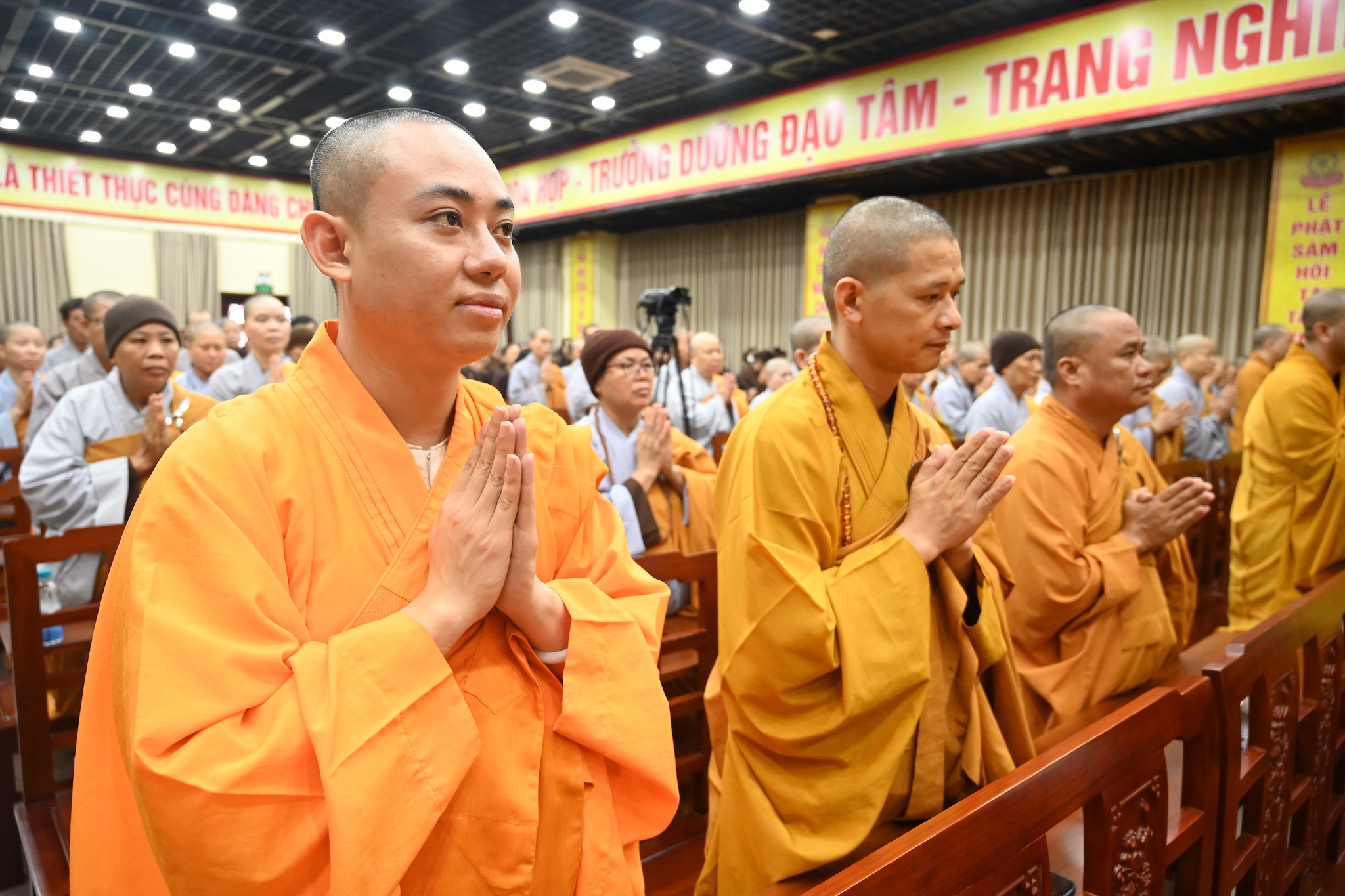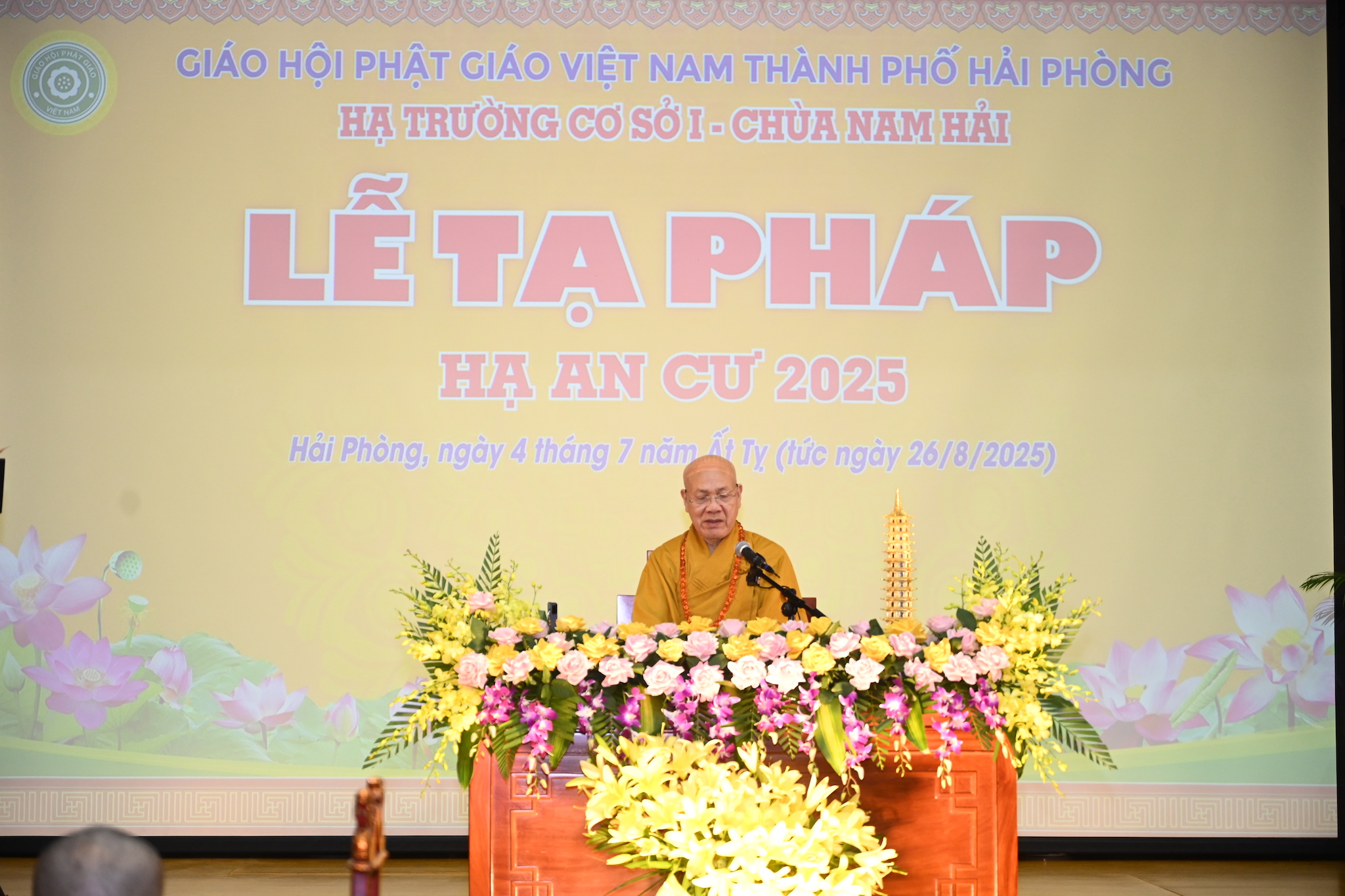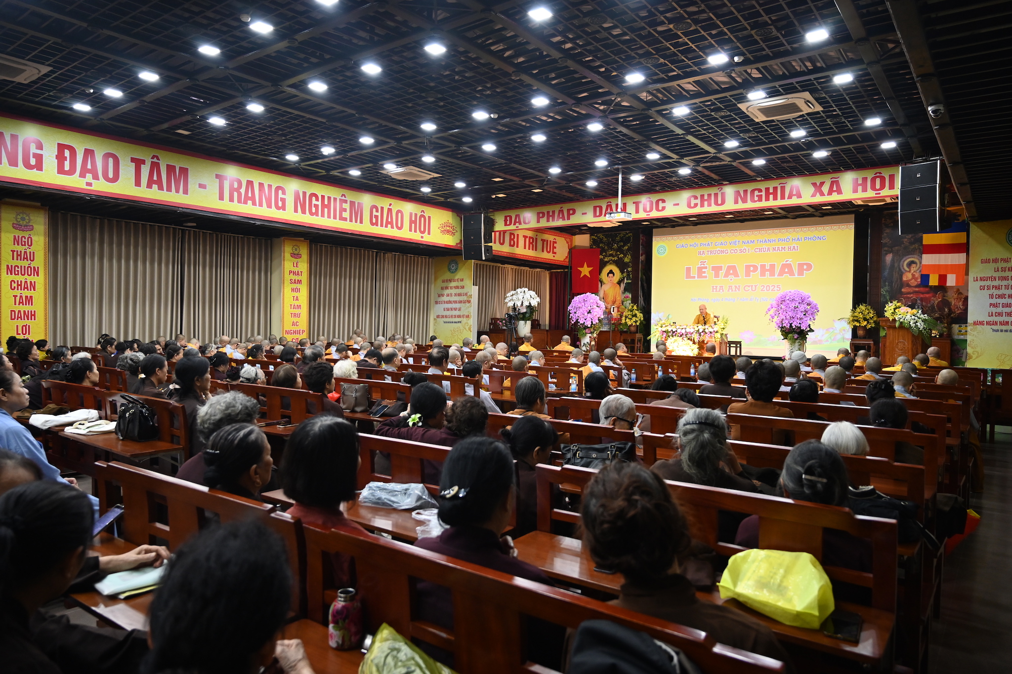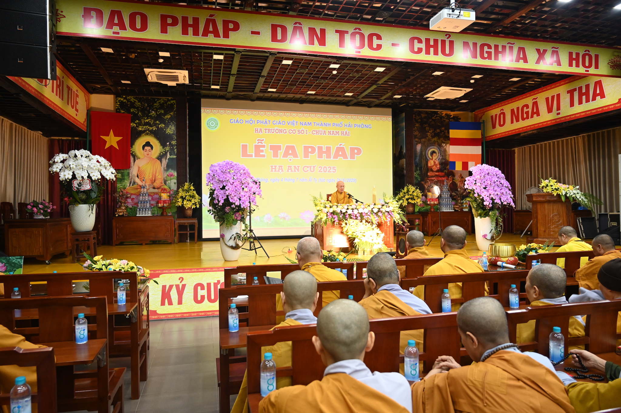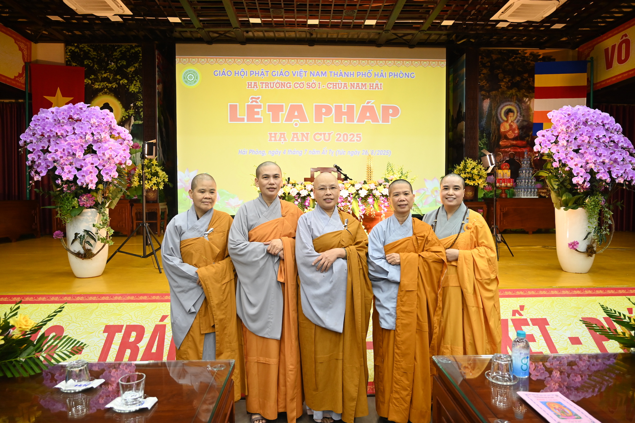 Quang lâm chứng minh và tham dự buổi lễ có Hòa thượng Thích Quảng Tùng – Phó Chủ tịch HĐTS GHPGVN, trưởng ban Ban trị sự GHPGVN thành phố Hải Phòng, trưởng Ban tổ chức khóa an cư kiết hạ PL. 2569 – DL. 2025, Đường chủ các cơ sở hạ trường tại thành phố Hải Phòng, chư tôn đức ban Duy Na, ban chức sự, cùng chư tôn đức là hành giả đang thực hiện cấm túc an cư tại hạ trường chùa Nam Hải và đông đảo Phật tử gần xa.