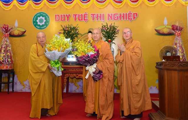 Hòa thượng đường chủ hạ trường tặng hoa chúc mừng