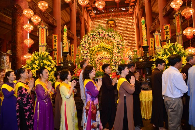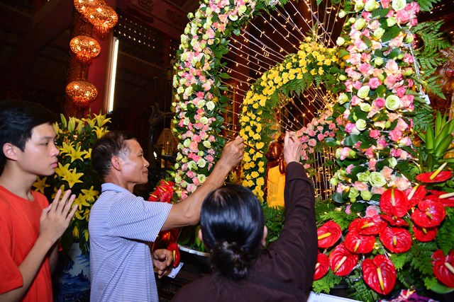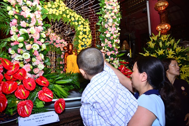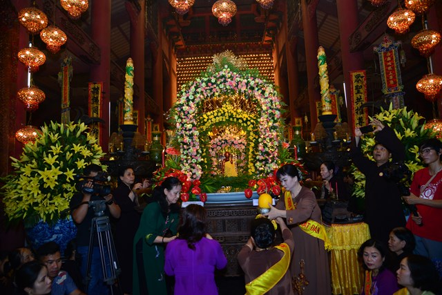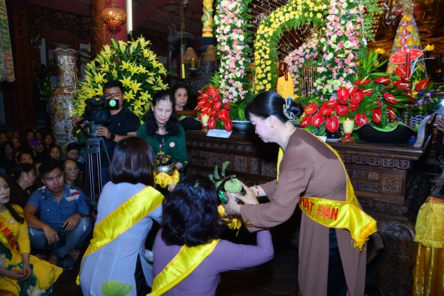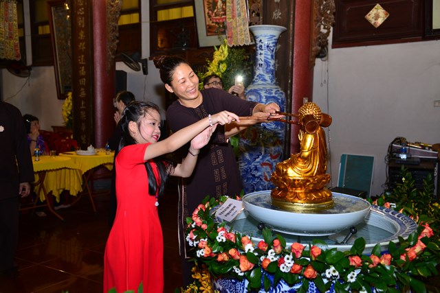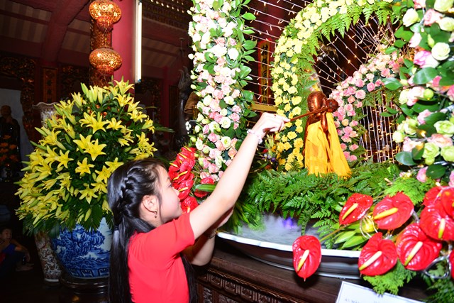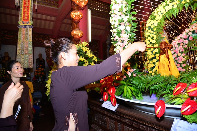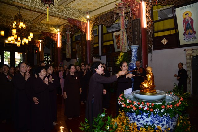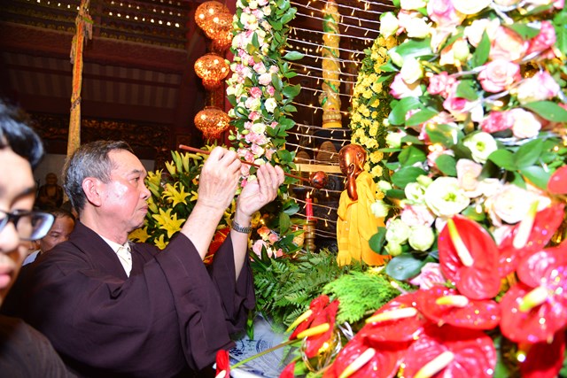 Trước khi kết thúc buổi lễ tâm linh, chư tăng trong chốn trụ xứ cùng toàn thể đại chúng đã đi kinh hành nhiễu Phật, niệm Phật tại chính điện và cử hành nghi lễ tắm Phật theo nghi thức truyền thống của Phật giáo Việt Nam trong không khí trang nghiêm, thành kính và rất đỗi linh thiêng nhân mùa Phật đản PL. 2563. Gần 700 Phật tử đứng xếp hàng trang nghiêm, thành kính lần lượt đối trước tôn tượng Đức Phật Thích Ca sơ sinh để dâng tịnh thủy cúng dàng lên Ngài và hành động này cũng chính là để chúng ta tự gột rửa tham – sân – si, gột rửa thân tâm của mình sao cho thân và tâm của mình ngày càng được trong sạch, nguyện sẽ thực hành theo đúng giáo pháp của Như Lai.
