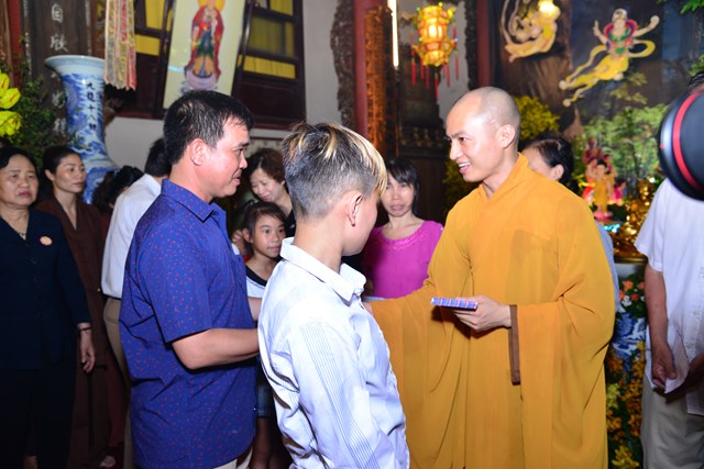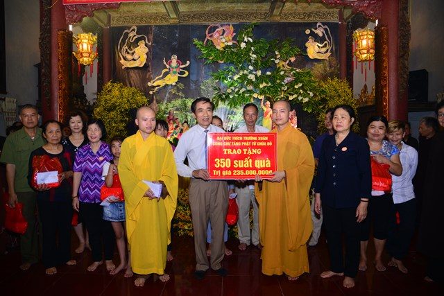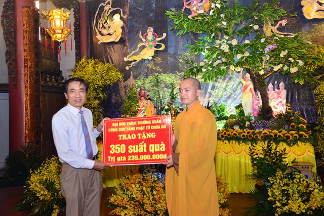 Trong không khí đại hoan hỷ của buổi lễ, chư tăng và Phật tử chùa Đỏ đã trao 350 phần quà với tổng giá trị là 235 triệu đồng cho 350 hộ gia đình có hoàn cảnh khó khăn, học sinh nghèo vượt khó, nhằm động viên chia sẻ với các hoàn cảnh khó khăn đang học tập, sinh hoạt trên địa bàn 3 quận: Ngô Quyền, Lê Chân và Hồng Bàng. Buổi phát quà ngoài chư Tăng và Phât tử chùa Đỏ còn có sự tham dự của đại diện hội Chữ Thập Đỏ thành phố Hải Phòng, các ông bà lãnh đạo đại diện cho ba quận nội thành được phát quà dịp này.