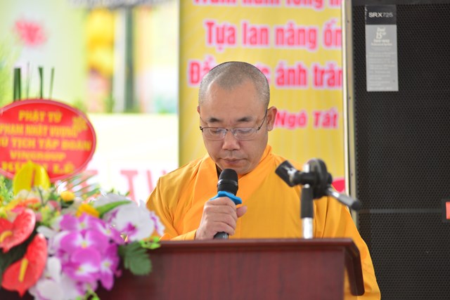 Thay mặt cho BTC đại lễ, TT. Thích Thanh Giác – Phó trưởng Ban thường trực BTS GHPGVN thành phố Hải Phòng, trưởng BTC đại lễ, trụ trì chùa Long Hoa đã lên cung tuyên tiểu sử của Đức vua Phật Hoàng Trần Nhân Tông Sơ tổ thiền phái Trúc Lâm Việt Nam ( 1258 – 1308). Đức Phật hoàng Trần Nhân Tông, tên húy là Trần Khâm, sinh ngày 07/12/1258 (11/11/Mậu Ngọ), con trưởng của Vua Trần Thánh Tông và Hoàng Thái hậu Nguyên Thánh. Thân hình Ngài có những đặc điểm khác thường, nhất là có màu vàng, nên được vua cha đặt cho biệt hiệu là Phật kim. Năm 16 tuổi, Ngài được lập làm Đông cung Thái tử và cùng năm Ngài kết duyên cùng công chúa Quyên Thánh, trưởng nữ Hưng Đạo Đại Vương. Năm 21 tuổi (1279), Ngài được Trần Thánh Tông truyền ngôi, trị vì thiên hạ Đại Việt, lấy đức trị vì, dân chúng an cư lạc nghiệp, lấy niên hiệu là Thiệu Bảo. Sau khi chinh phạt Ai Lao, Ngài trở về Hành cung Vũ Lâm – Ninh Bình, cầu Quốc sư Huệ Tuệ làm lễ xuất gia, tập sự tu hành tại đây một thời gian. Năm 1299, Ngài quyết tâm trở lại thăm Kinh sư lần cuối, rồi đi thẳng lên núi Yên Tử – Quảng Ninh quyết chí tu hành, tham thiền nhập định, lấy tên là “Hương Vân Đại Đầu Đà” và độ Đồng Kiên Cương làm đệ tử và ban pháp hiệu là Pháp Loa. Ngài xả báo an tường, thâu thần thị tịch ngày 01/11/Mậu Thân (1308). Thọ thế 51 năm tại am Ngọa Vân – Đông Triều – Quảng Ninh.