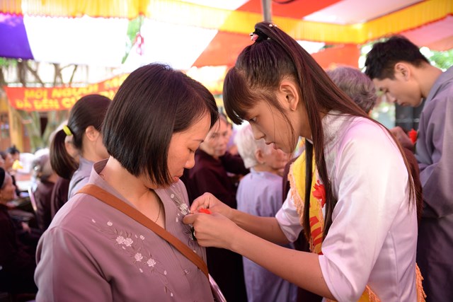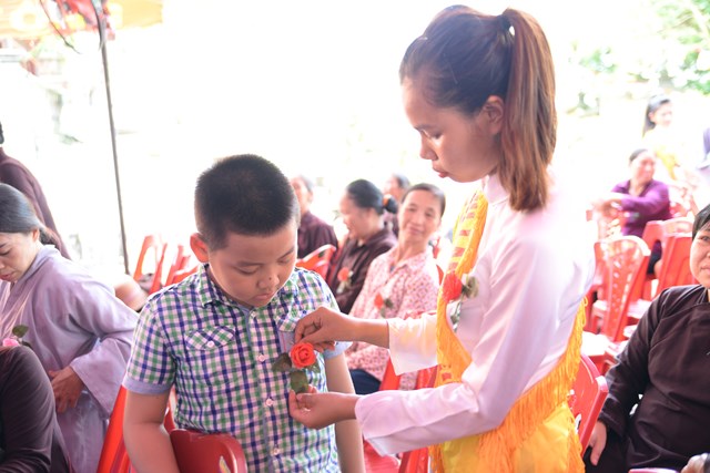 Một nghi thức rất quan trong, không thể thiếu được trong mỗi buổi lễ Vu Lan. Đó là nghi lễ “ Bông Hồng Cài Áo”. Mục đích của nghi lễ này là để tưởng nhớ tới công ơn sinh thành, dưỡng dục của 2 đấng song thân. Trong nghi lễ này, dường như tất cả những ai có mặt tại buổi lễ cũng đều cảm nhận được ở đó có một sự thiêng liêng mà gần gũi khi được đón nhận bông hồng, nâng niu, cẩn trọng cài lên ngực. Những người còn cha mẹ thì được cài lên ngực áo bên trái của mình một bông hồng màu đỏ để cảm nhận niềm hạnh phúc và tự nhủ luôn biết cố gắng không làm cho cha mẹ phải phiền lòng, còn những ai không còn cha mẹ thì cài lên ngực áo của mình một bông hoa hồng màu trắng để tưởng nhớ đấng công ơn sinh thành, giáo dưỡng, nếu chỉ còn cha hoặc mẹ thì cài bông màu hồng. Và khó ai có thể kìm nén được cảm xúc trong phút giây lắng lòng, thành tâm dâng lên đấng sinh thành đóa hương Tâm tri ân, thành kính. Nhưng dù là cài trên ngực mình bông hồng màu nào đi chăng nữa thì cha mẹ vẫn luôn hiện hữu ở trong tâm trí của mỗi chúng ta.