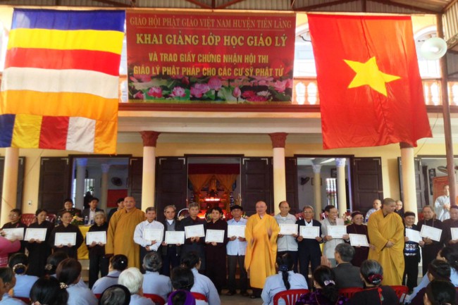 Tại buổi lễ, TT. Thích Thanh Giác Phó trưởng Ban thường trực Ban Hoằng Pháp TƯ GHPGVN, Phó trưởng Ban thường trực Ban trị sự GHPGVN Tp. Hải Phòng và ĐĐ. Thích Quảng Minh – Trưởng Ban trị sự GHPGVN huyện Tiên Lãng đã trao giấy chứng nhận tham gia Hội thi giáo lý cấp quận huyện, cấp thành phố cho các Phật tử tham dự kỳ thi giáo lý cấp huyện và cấp thành phố vào đầu tháng 9 năm 2014.