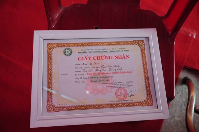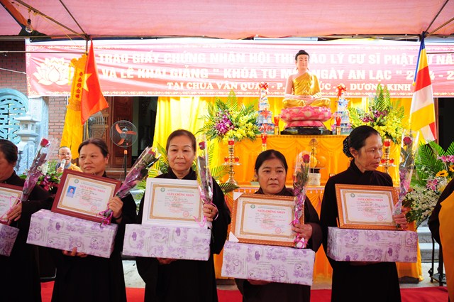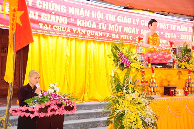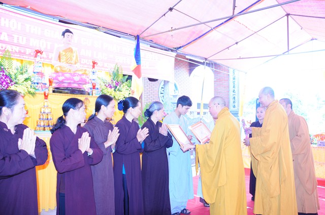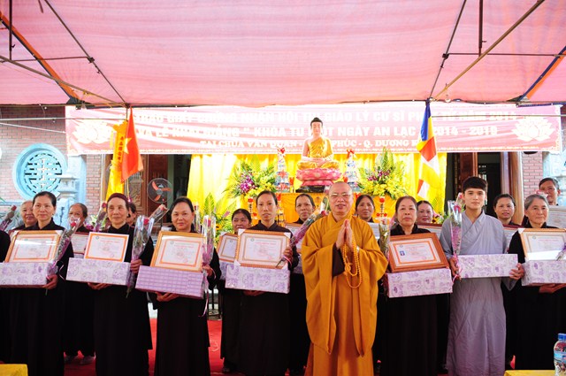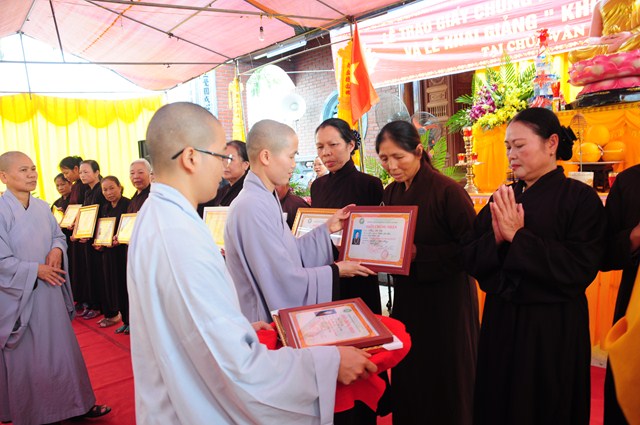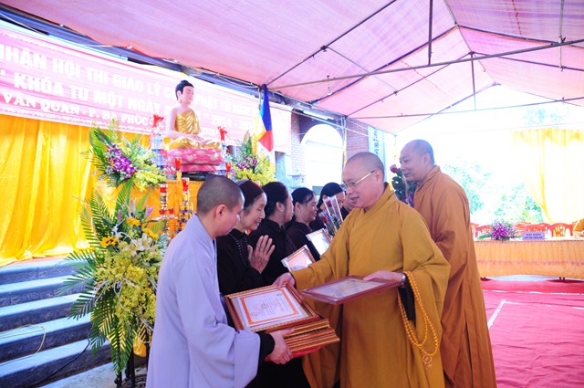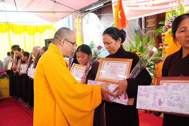 Tại buổi lễ, TT. Thích Thanh Giác và chư tôn đức Tăng Ni đã trao giấy chứng nhận thi giáo lý cấp quận, cấp thành phố cho các nam nữ cư sỹ Phật tử đã tham dự kỳ thi giáo lý vừa qua.