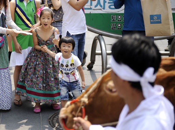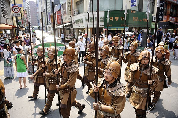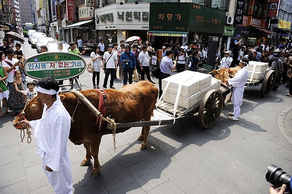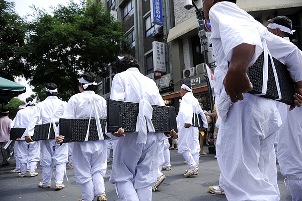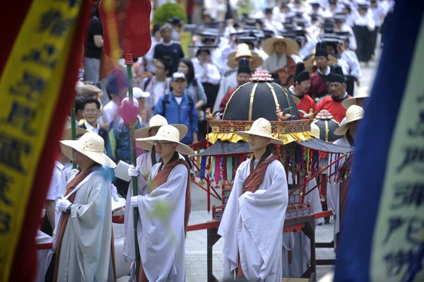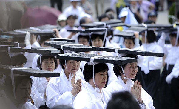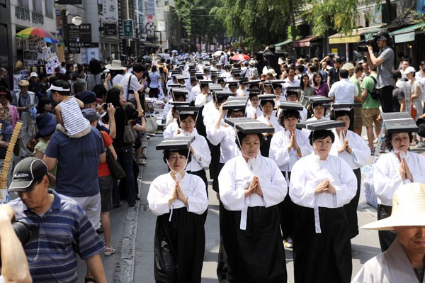Phật tử trên đầu đội những mộc bản Tam Tạng Kinh đi nhiễu hành vòng quanh thành phố Seoul, cho toàn dân Hàn Quốc và khách Quốc Tế ôn lại lịch sử Bát Vạn Đại Tạng Kinh Cao ly.