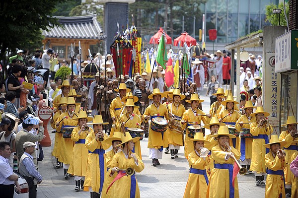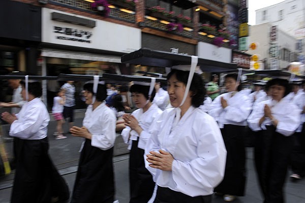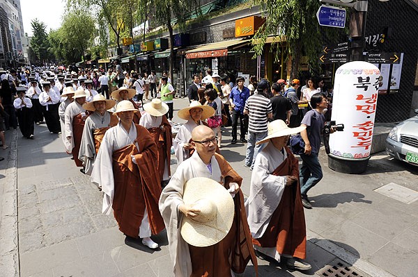 Hàng ngìn người cung kính nhiễu hành cúng dường Pháp Bảo, đoàn người ngoài chư tôn đức Tăng già, nam nữ Phật tử, đại diện giới quan chức chính quyền, đơn vị quân đội mặc giáp phục thời Quân chủ, ban nhạc dân tộc cổ truyền, quan khách quốc tế tuần tự thật nghiêm trang, xuất phát từ Tổ đình Tào Khê dọc theo đường Nhân Tự động (Insa-dong) – Chung Lộ (Chongno) 2 – Cheonggyecheon (Thanh Khê Xuyên – một dòng suối dài 5, 8 km chảy qua khu trung tâm Thành phố Seou), đoàn người sắp hàng thứ tự hơn 1,5km đường dài.