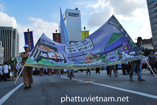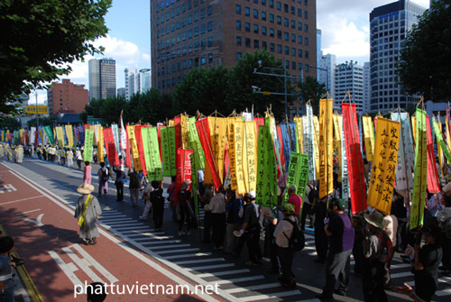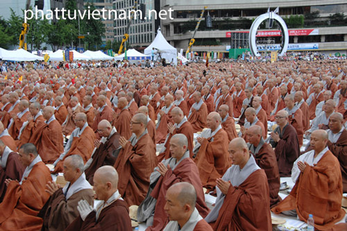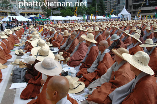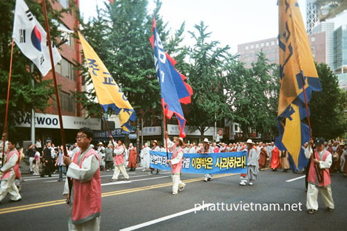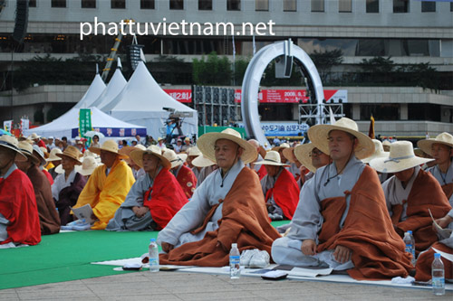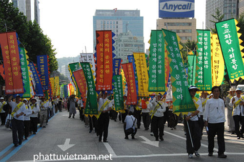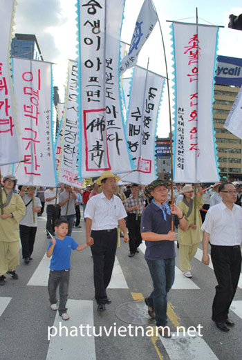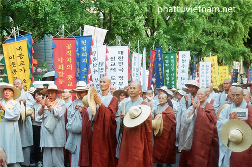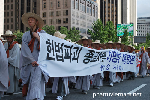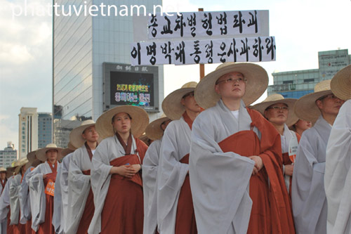 Sau khi biểu tình trước Tòa thị chính Seoul, các Tăng Ni và Phật tử đã niệm Phật, tuần hành trên đường phố kéo dài 5km để về chùa Jogye.
