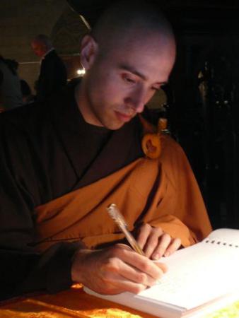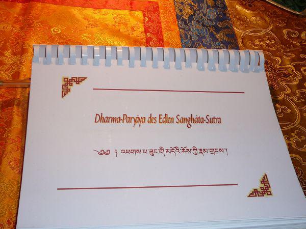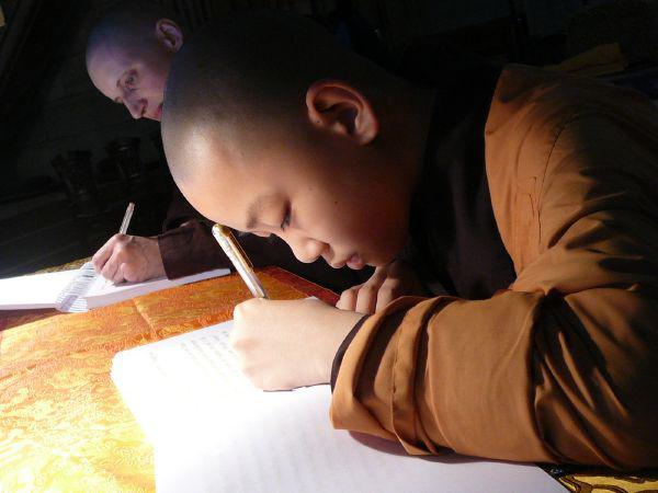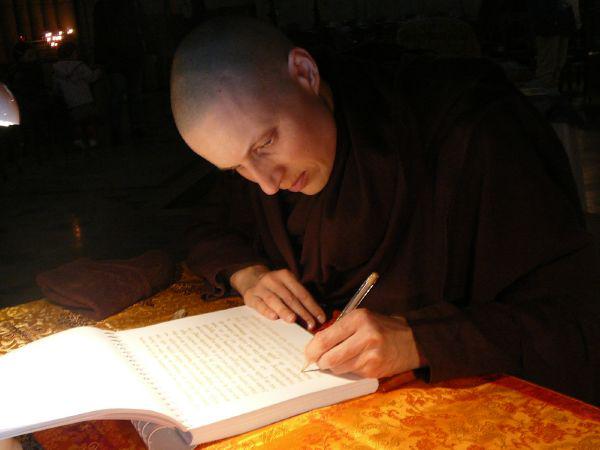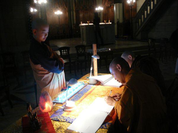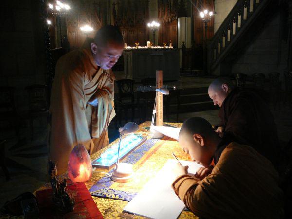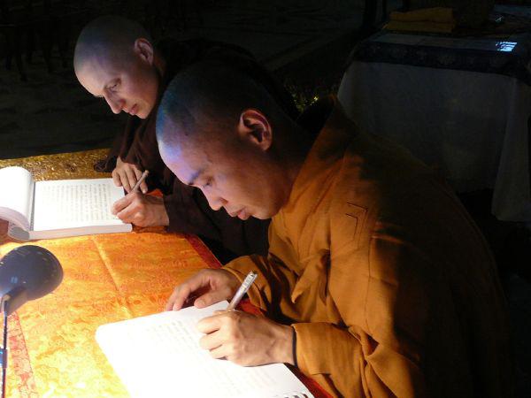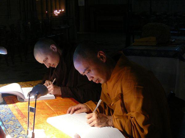 Sau khi hữu nhiễu, Thượng tọa cùng chư đệ tử đến bàn chép những trang kinh, như ôn lại các dấu tích mà thuở xưa chư Phật và chư Tổ đã truyền trao cho hàng hậu thế. Đây, như một sự nối tiếp truyền thừa không mõi của những người đi trước. Đồng thời gieo duyên lành để Phật pháp mãi trường tồn tại thế gian