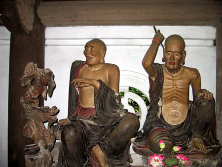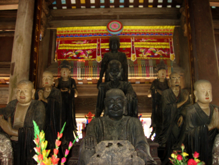 Chùa thờ tam bảo ở ba tòa nhà , có 62 pho tượng lớn nhỏ phần nhiều bằng gỗ mít , trong đó có tượng của 18 vị Phật tổ được các nghệ nhân tạo tác một cách tinh vi và sinh động . Ðặc biệt là tượng Tuyết Sơn (thờ giữa tam bảo chùa giữa) , các pho tượng La Hán (thờ ở chùa Thượng) , bát bộ Kim Cương (thờ ở chùa Hạ) với những đường nét điêu khắc kỹ thuật điêu luyện tuyệt mỹ của nghệ nhân đương thời đã tạo nên những vi La Hán vui , buồn , khắc khổ , suy nghĩ , trầm tư. Nhà thơ Huy Cận đã diễn tả các vị La Hán chùa Tây Phương : “Mỗi người một vẻ mặt con người”.