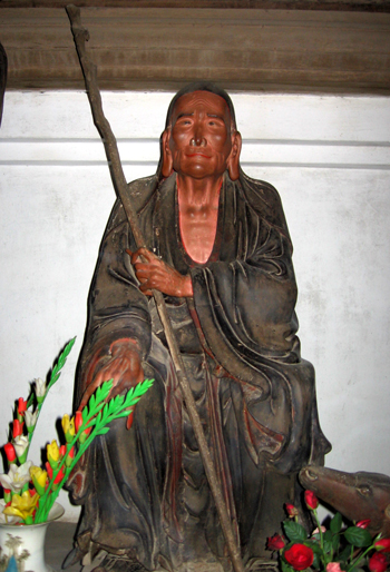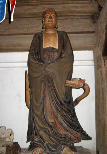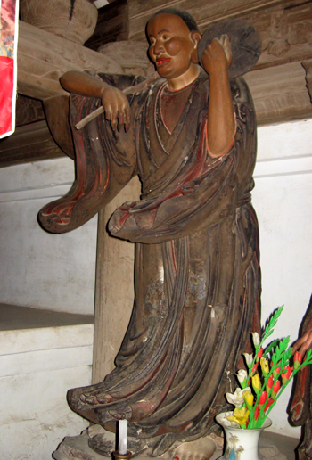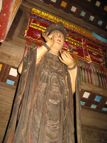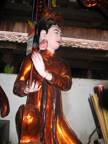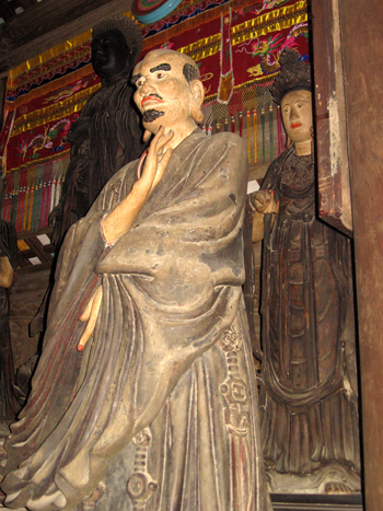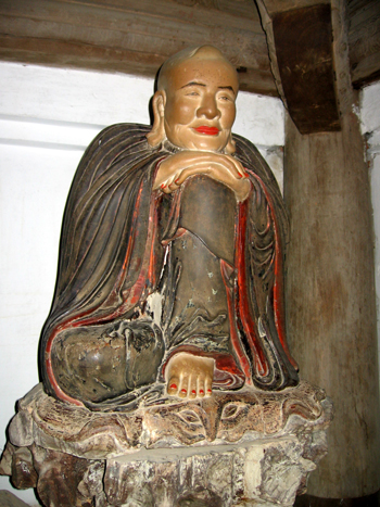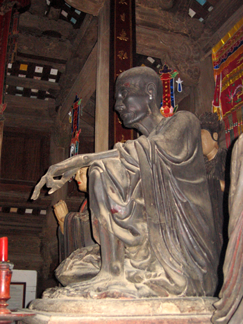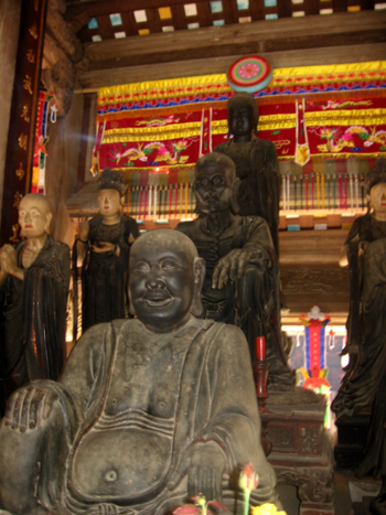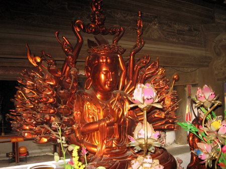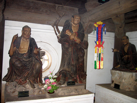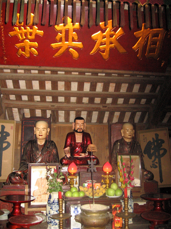 Trên cùng: Đại Thế Chí Bồ Tát – Tượng Phật A Di Đà – Tượng Quan Âm Bồ tát, lớp thứ hai: Anan, Thích Ca Tuyết Sơn, Cadiếp, lớp thứ ba: Phật Di Lặc