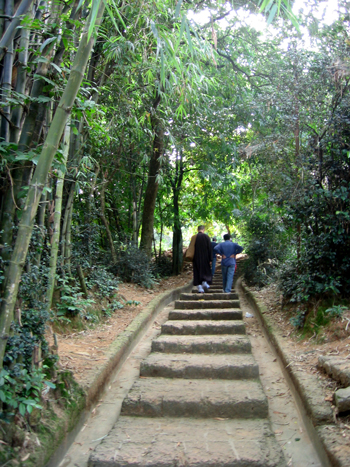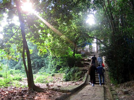 Từ dưới chân núi theo con đường dốc dài khoảng 162 mét , có 238 bậc cấp xây bằng đá ong thì đến sân tam quan chùa.