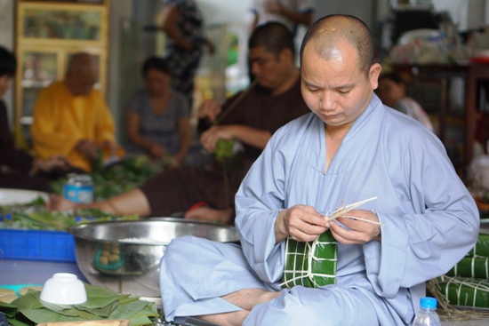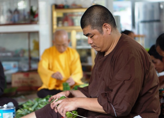 Chư Tăng,Phật tử chung tay với công việc thường niên này, điều đặc biệt trong năm nay Hòa thượng viện chủ đã trực tiếp nứt bánh và làm việc với mọi người. Hòa thượng cũng hướng dẫn mọi người cách nứt bánh sao cho chặt để khi hấp đòn bánh vẵn được đẹp như lúc ban đầu.