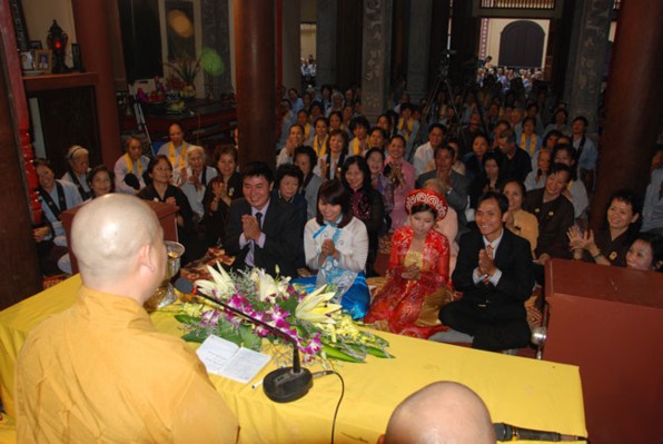 Qua đó, TT cũng nương vào lời dạy của đức Phật – Ngài đã từng rất quan tâm đến đời sống hạnh phúc của người cư sĩ tại gia, đã nêu ra 5 giới, Thập thiện giới v.v… để khai thị và quy y cho các bạn trẻ, giúp các bạn hiểu rõ về giá trị của hạnh phúc trước ngưỡng cửa hôn nhân.
