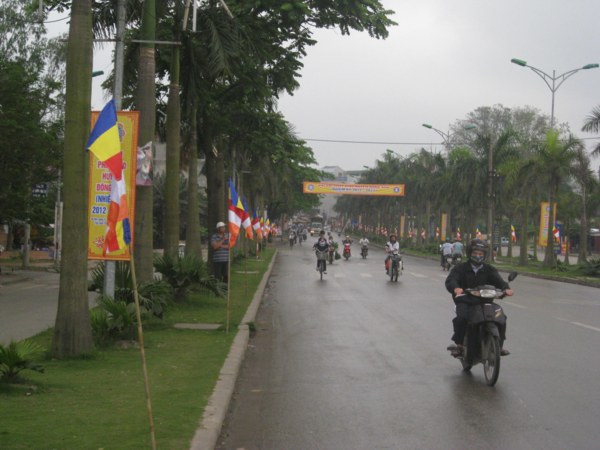 Đại lộ trung tâm chạy dọc thị trấn ngang qua nhà Văn hóa được trang hoàng rực rỡ cờ, phướn, băng-rôn, khẩu hiệu Phật giáo chào mừng Đại hội.