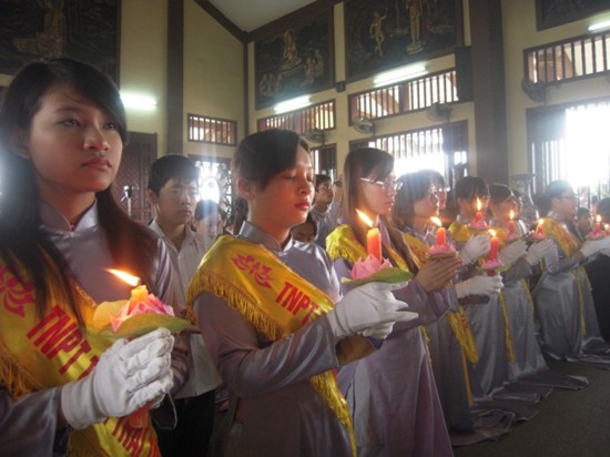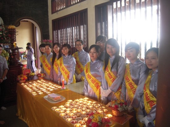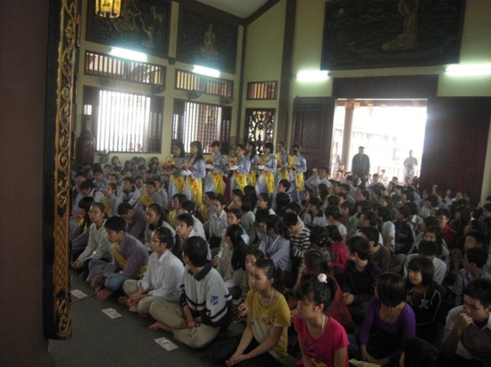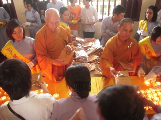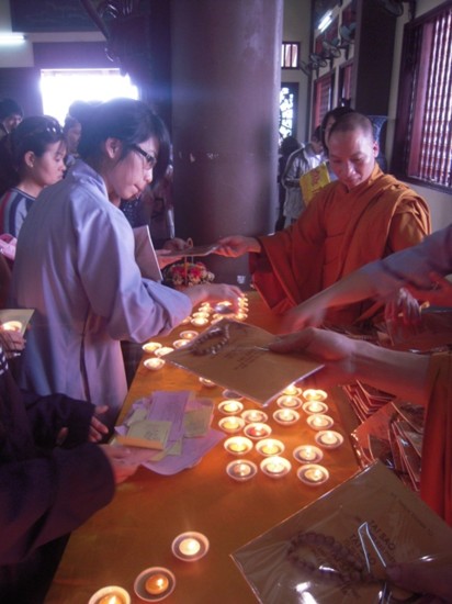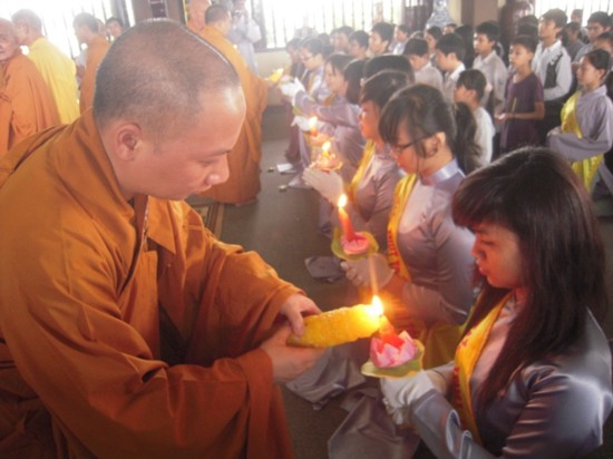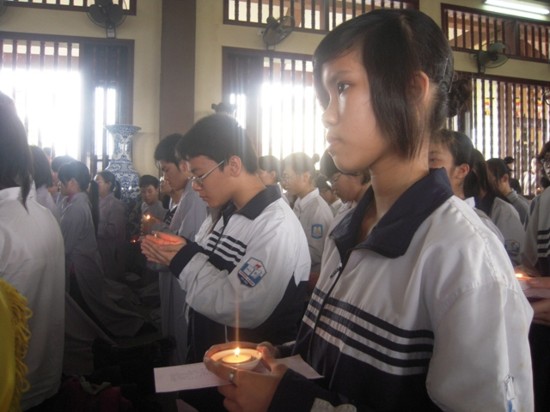 Ngay sau đó, chư Tôn đức Tăng Ni đã quang lâm chánh điện làm lễ cầu nguyện. Mở đầu nghi lễ là màn truyền đăng, ngọn lửa được lấy từ Tam Bảo đã được chư Tôn đức truyền tới các em học sinh, ngọn lửa trí tuệ được thắp sáng, các em cũng trực tiếp gửi những thẻ cầu nguyện của mình lên Tam Bảo.