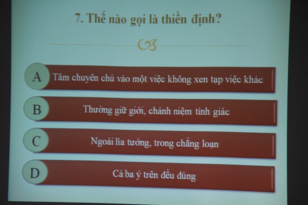 “Là Phật tử tu theo đường lối của Hòa thượng tôn sư, con hiểu thế nào về pháp môn Hòa thượng đã đưa ra là “biết vọng không theo” , con đã ứng dụng tu tập và đạt được những lợi ích gì từ pháp môn này?”.