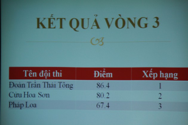 Kết thúc cuộc thi giáo lý, ban thư ký đã đưa ra số điểm tổng kết của cả ba vòng, và đội đã đạt được giải nhất đó chính là đoàn TTNPT Trần Thái Tông, về thứ hai là chúng Cửu Hoa Sơn – Đạo tràng doanh nghiệp Intraco và thứ ba là chúng Pháp Loa. Tuy còn là một chúng non trẻ, mới thành lập được 4 năm trở lại đây, nhưng dưới sự chỉ bảo ân cần và sát sao của các quý thầy trong ban giáo thọ, đoàn TTNPT Trần Thái Tông đã chứng minh được rằng tuổi trẻ là lớp người xứng đáng kế cận sự nghiệp tiếp nối mạng mạch Phật Pháp nói chung và mạng mạch thiền tông VN nói riêng. Đặc biệt hơn nữa, ở cả 3 phần thi đoàn TTNPT Trần Thái Tông đều đạt được số điểm cao nhất và đã nhận được món quà của thầy Trụ trì đó là “ Đại bảo tháp Xá Lợi” được cung rước từ Ấn Độ.