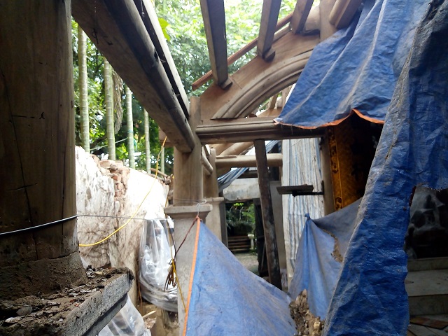 Cũng vì vậy, hai hàng tượng của chùa bằng chất liệu đất đang xuống cấp nghiêm trọng, không còn nguyên vẹn có thể đổ sụp bất cứ lúc nào. Ám ảnh hơn, có tượng, rơi đầu chỉ còn chiếc cọc đóng làm khung tre chồi lên.