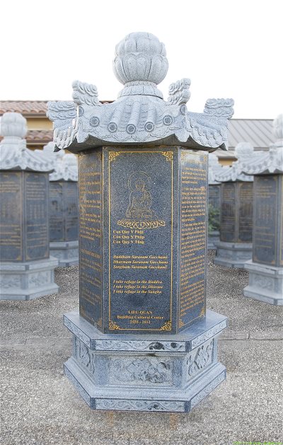 Đặc biệt, chùa có bộ kinh Pháp Cú khắc trên đá được hoàn thành vào năm 2012. Có tất cả 75 trụ đá cẩm thạch 6 mặt, mỗi trụ cao 1,93m, nặng 1.600kg. 73 trụ đá khắc bộ kinh Pháp Cú bằng 3 ngôn ngữ : Việt, Anh, Hoa. Kinh Pháp Cú thuộc tiểu bộ của Đại Tạng Pali. Kinh có 26 phẩm được kết tập và sắp xếp theo từng chủ đề gồm 423 kệ ngôn được đức Phật tuyên thuyết trong nhiều trường hợp với nhiều đối tượng khác nhau ở cả 2 giới xuất gia và tại gia. Đây chính là Giáo pháp chân thực mà đức Phật đã khai thị cho thế gian. Có 1 trụ đá khắc các bài chú Đại Bảo, chú Đại Bi, chú Chuẩn Đề, chú Vãng Sanh và 1 trụ đá khắc 3 pháp quy y, 5 giới của Phật tử … Công trình do Tỳ kheo Thích Pháp Chơn khởi xướng và Phật tử chùa Liễu Quán cúng dường. Lời phi lộ trên bia ghi rõ : “Nguyện đem công đức ấn tống này hồi hướng cầu nguyện cho Phật Pháp được lưu truyền, thế giới hòa binh, người còn kẻ mất đều được thành Phật đạo”.