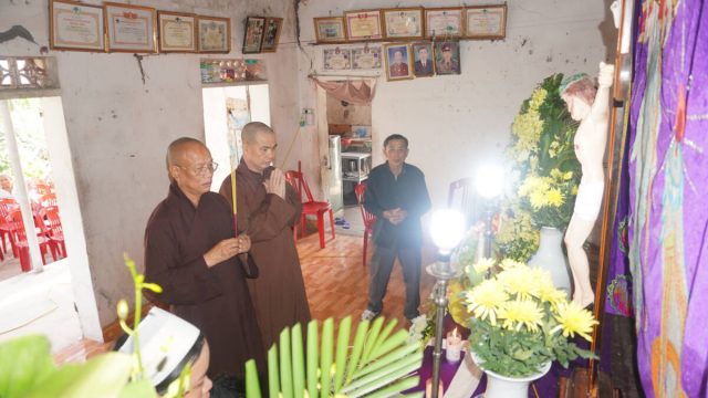 Đoàn Phật sự đã đến tổ dân phố số 3, xã Hải Thịnh, ân cần thăm hỏi gia đình chị Nguyễn Thị Kiều (SN 1989, xã Hải Thịnh) – nạn nhân xấu số đã tử vong trong trận lốc xoáy. Trước bàn thờ chị, Hòa thượng Thích Quảng Hà cùng chư Tôn đức đã dâng nén tâm hương tưởng niệm, chia sẻ nỗi đau mất mát với gia đình.