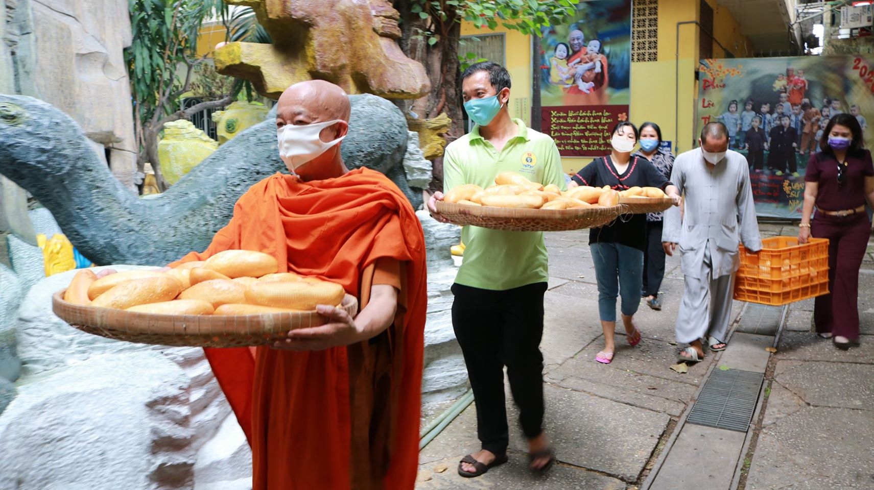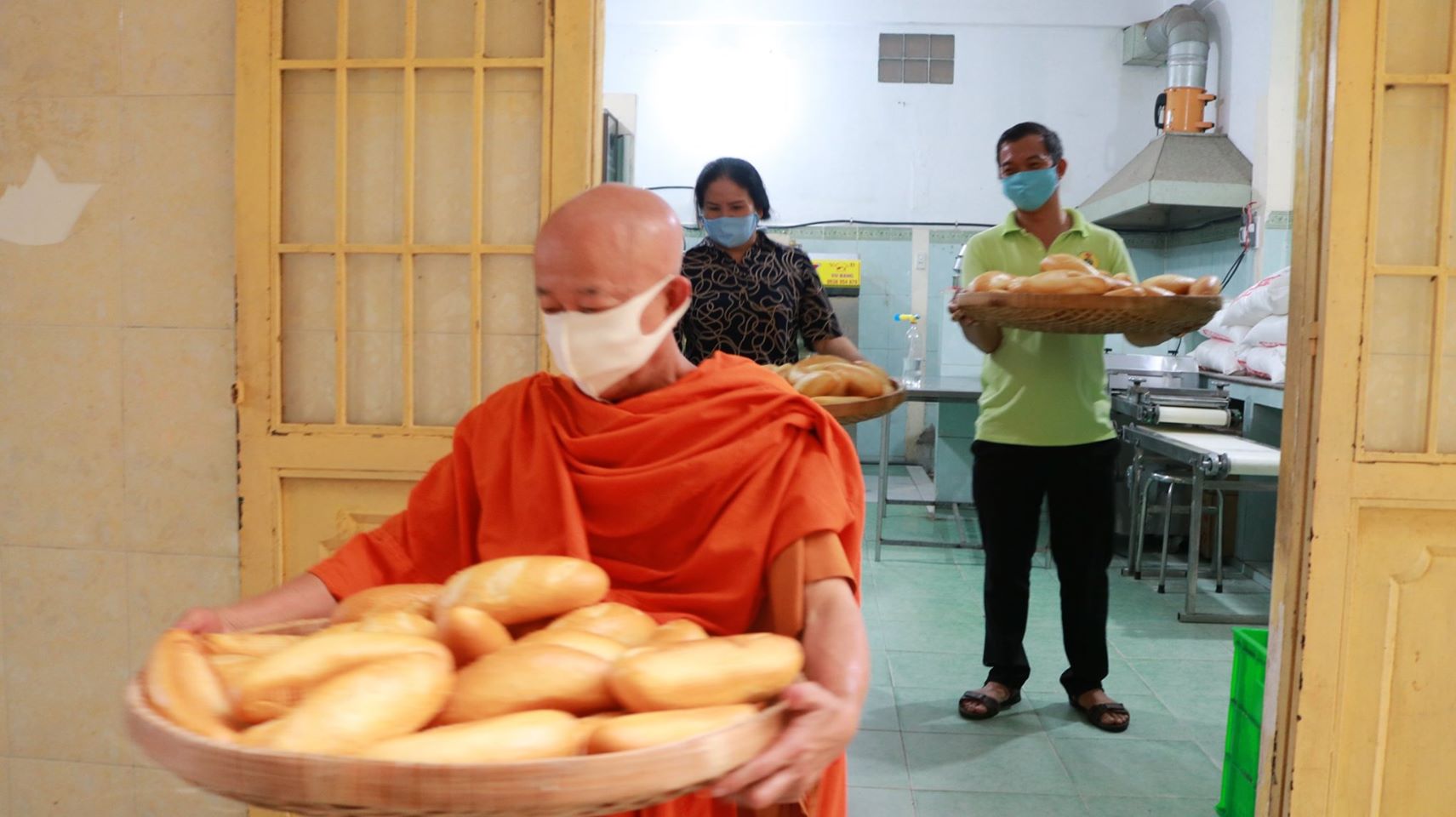 Từ nhiều ngày qua, khi nhận giàn máy làm bánh mì trị giá hơn 200 triệu do các nhà tài trợ giúp đỡ đem đến lắp ráp, Hòa thượng Thích Thiện Chiếu và các đồng sự của mình vừa học vừa làm theo quy trình dây chuyền hiện đại để cho ra đời mỗi ngày gần 300 chiếc bánh nóng hổi, thơm ngon, trao tận tay những người dân nghèo khó, kịp giúp họ trang trải bữa ăn trong những ngày gồng mình thực hiện cách ly xã hội do Covid-19…