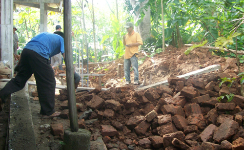 Những công nhân đang thi công chùa Trà Sơn và những viên gạch Chăm vương vãi bên cạnh