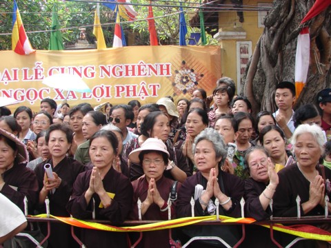 Trời nắng gắt, các phật tử đến ngày càng đông, nhưng số người đeo thẻ để vào được bên trong chùa không nhiều. Ở góc tường, một phật tử chăm chú đọc kinh Sám nguyện. Đó là bà Trần Thị Lâm (hiệu Diệu Phú) năm nay 72 tuổi, vào làm phật tử ở chùa Quán Sứ từ năm 1993. Bà Lâm đã biết sự kiện cung nghênh ngọc xá lợi từ cách đây mấy tháng và cảm nhận rõ đây là sự kiện trọng đại, có giá trị văn hoá tâm linh sâu sắc, góp phần truyền bá giáo lý Đức Phật.