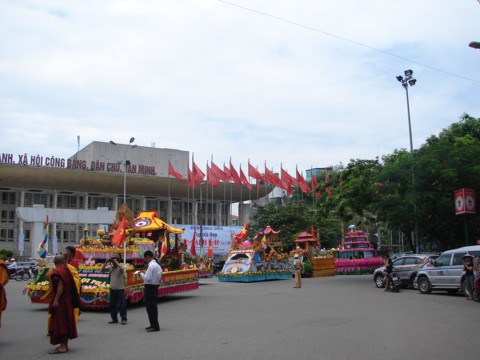 Trên đường đi, hai chiếc xe hoa thu hút sự chú ý của nhiều người dân. Khi xe hoa đi qua, họ thành kính chắp tay, tụng niệm hướng tâm về Phật.