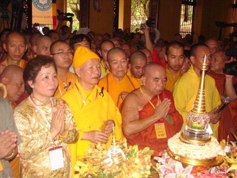 Lễ nghênh đón và cầu kinh được tiến hành trong vòng hơn 30 phút, với sự tham gia của Phó Chủ tịch Nước Nguyễn Thị Doan và lãnh đạo Trung ương Giáo hội Phật giáo VN, với nhiều nghi thức lễ phật theo lối Nam tông, Bắc tông, khai mở Bảo tháp… Ngay sau đó, hai chiếc xe hoa rực rỡ chở xá lợi phật cùng đoàn nghênh đón lên đường đến chùa Bái Đính (Ninh Bình).