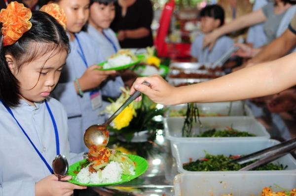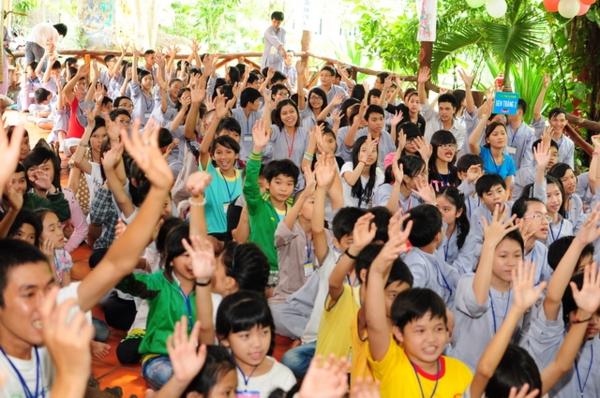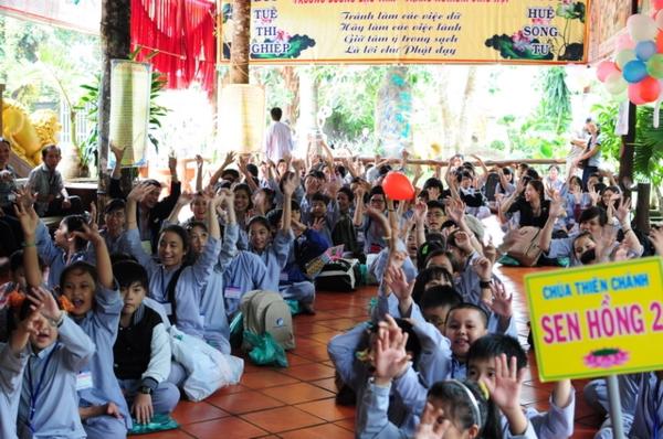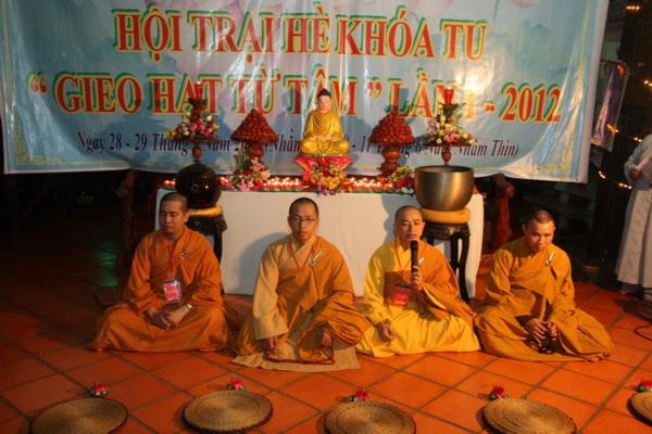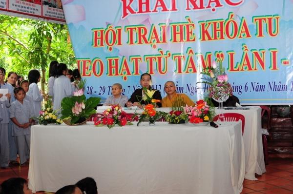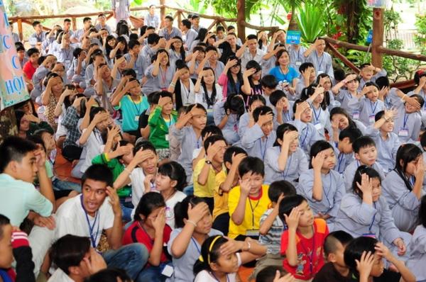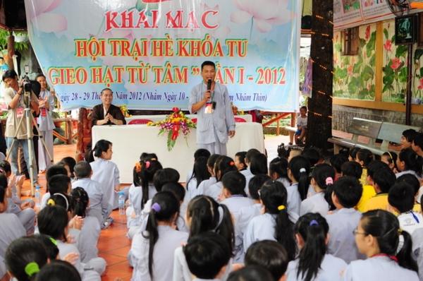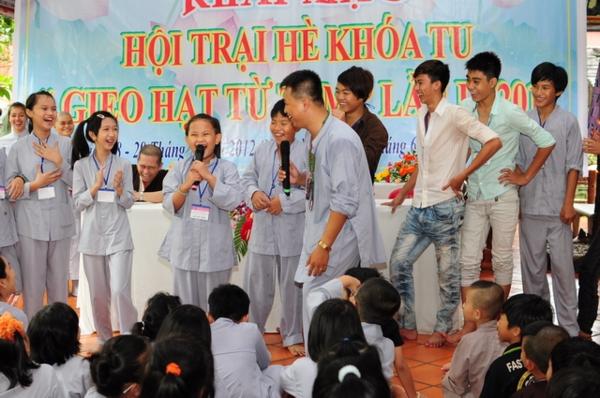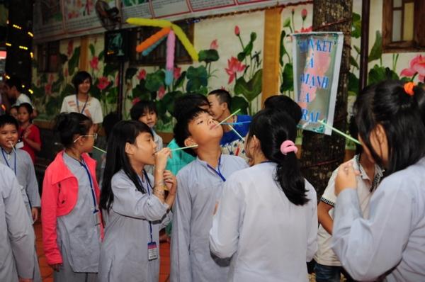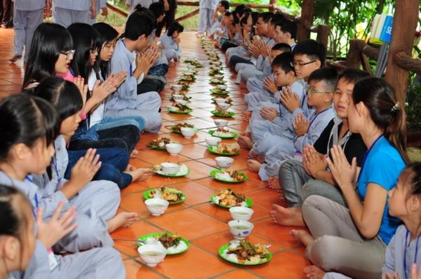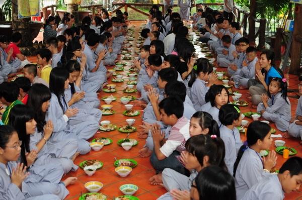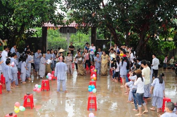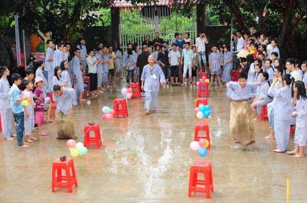 Buổi trưa, các em được quý thầy cô hướng dẫn ăn cơm thiền hành trong chánh niệm. 13h30 chiều, các bạn trẻ của hai chùng được thi trò chơi lớn, trò chơi dân gian. Mặc dù trời đã đổ những giọt mưa, nhưng với sự nhiệt tình, năng động của tuổi trẻ, các khóa sinh đã tham gia rất hào hứng, sôi nổi. Mang lại rất nhiều tiếng cười và tràng pháo tay cho các em. Ngày đầu tiên như thế đã quên đi các mệt mọi của bụi đường. Sau giờ thi trò chơi lớn là giờ khai mạc khóa tu.