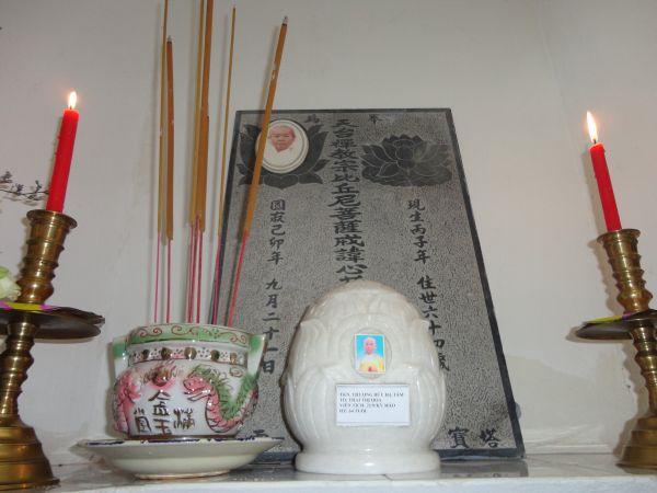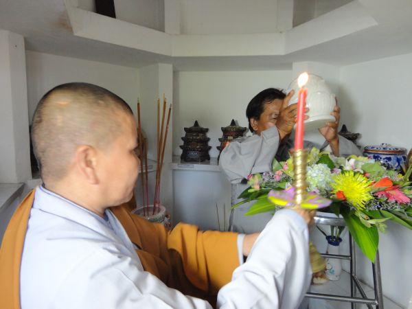 Trong tiếng niệm Phật vang rền của đại chúng, chư tôn thiền đức Tăng Ni, chư vị Phật tử đã cung thỉnh hài cốt của Ni trưởng nhập đại bảo tháp tháp tại chùa.