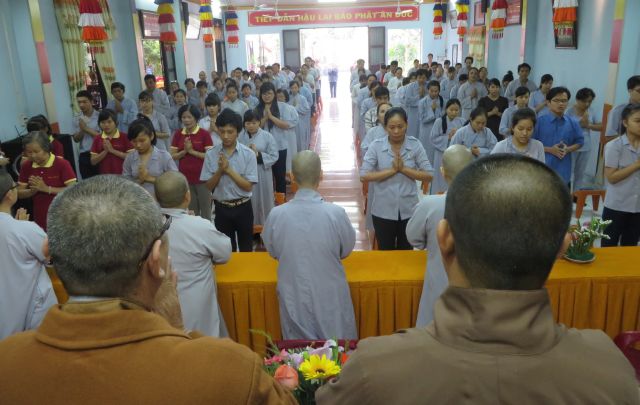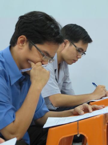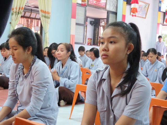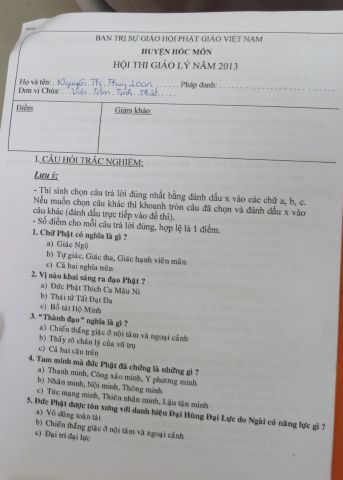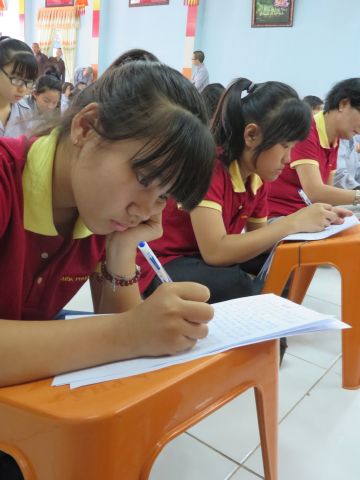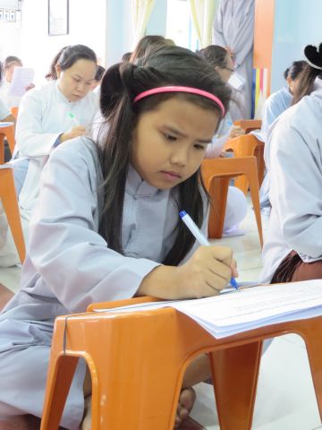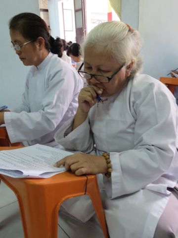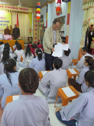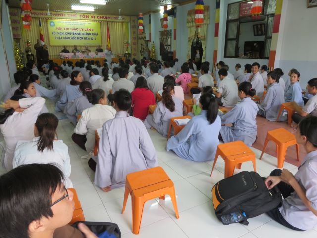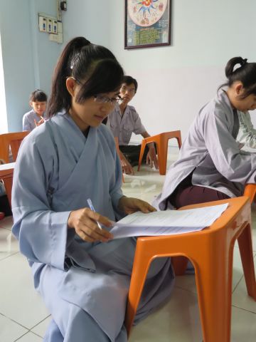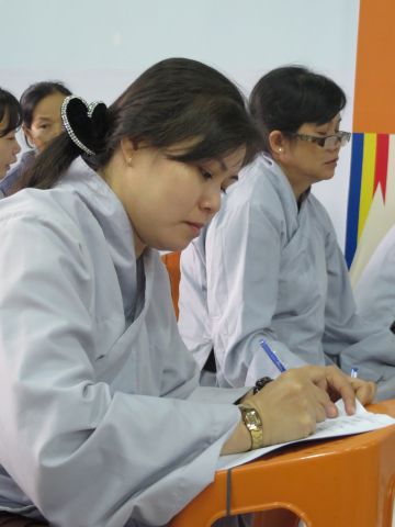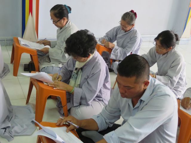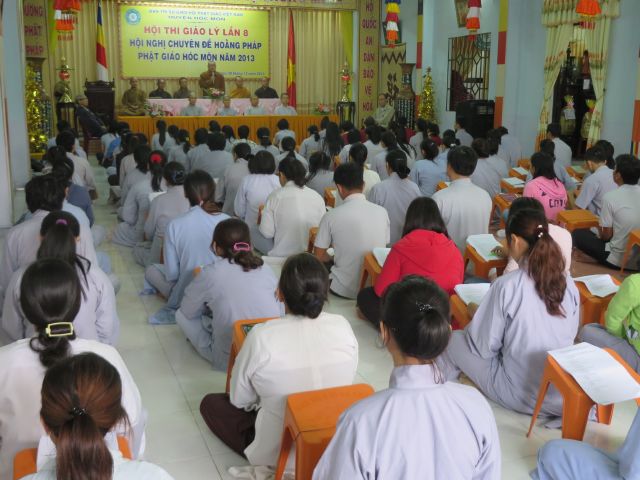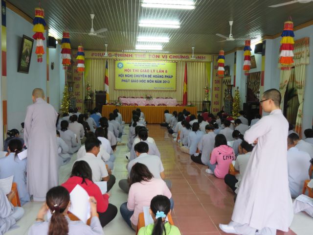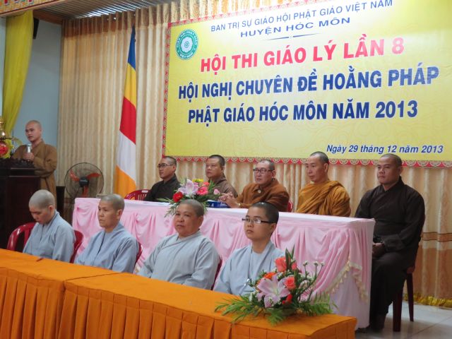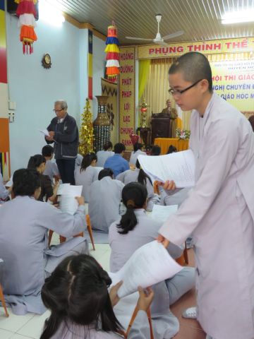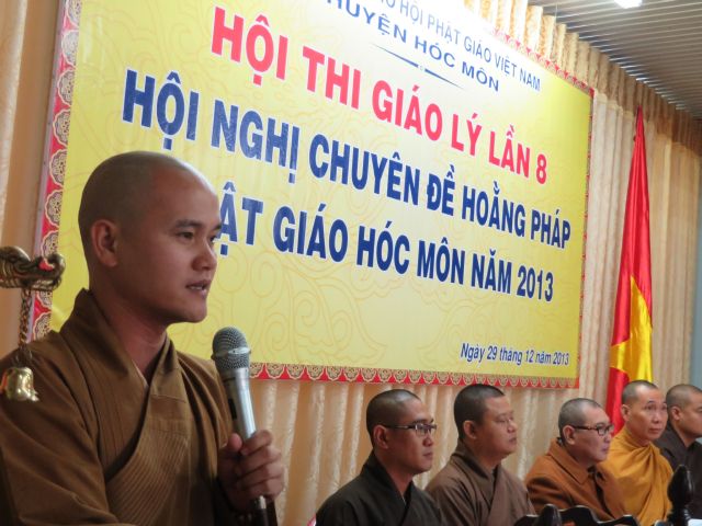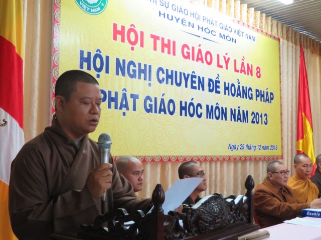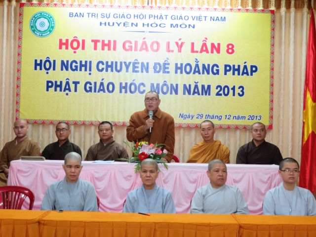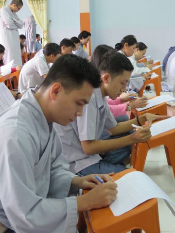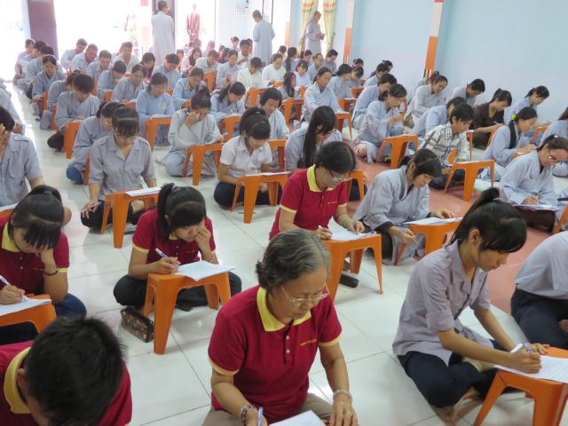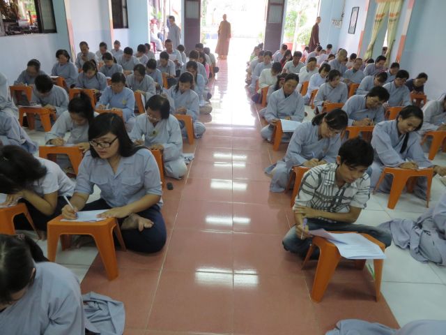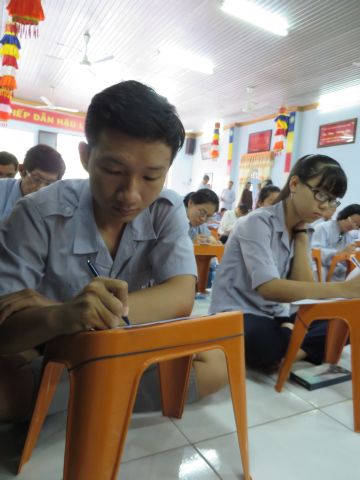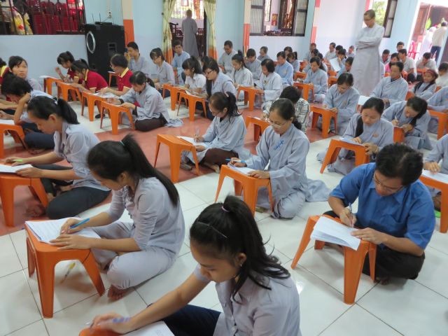 “Tuy là cuộc thi, nhưng không ngoài mục đích ôn tập giáo lý, trao đổi, học hỏi lẫn nhau, khích lệ tinh thần tu học của người con Phật, không phải hướng đến tranh giành hơn thua” – Đại đức Thích Minh Thanh, Phó BTS PG huyện Hóc Môn đã ân cần nhắc nhở quý Phật tử trong lời phát biểu khai mạc cuộc thi. TT. Thích Chơn Trí, UV Kiểm Soát BTS PG huyện Hóc Môn còn căn dặn thêm: “học giáo lý đạo Phật, điều quan trọng là thực hành, ứng dụng vào cuộc sống để mang lại lợi lạc cho mình và người, thi cử chỉ là phương tiện để kiểm chứng kết quả học tập của mình mà thôi.” Với tinh thần đó, các thi sinh đã bước vào kỳ thi với tâm lý hết sức nhẹ nhàng và hoan hỷ. Đề thi ngoài phần trắc nghiệm, còn có phần tự luận để thí sinh bày tỏ những suy tư về giáo lý Phật Đà trong đời sống hằng ngày. Qúy Phật tử tỏ ra rất tập trung và hứng thú hoàn thành các phần thi của mình, không có ai là không làm được.