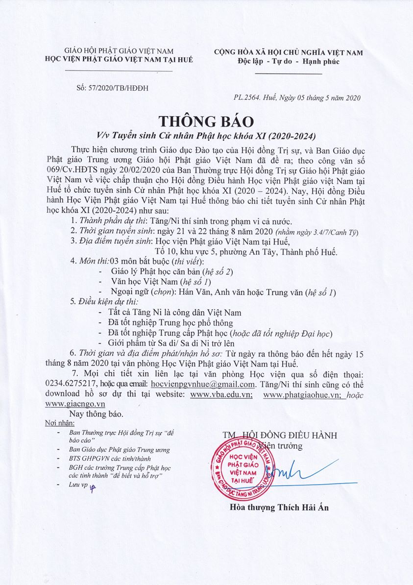 Hội đồng Điều hành Học viện Phật giáo Việt Nam tại Huế đã ra thông báo số 57/2020/TB/HĐĐH ngày 05/5/2020 đến Tăng Ni thí sinh trong phạm vi cả nước về việc tuyển sinh Cử nhân Phật học khóa XI (2020-2024).