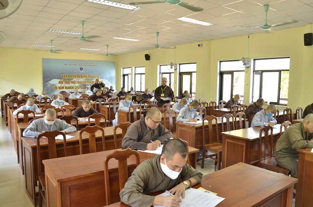 Trước khi làm bài, HT.Thích Quang Nhuận – Thành viên Hội đồng Chỉ đạo Học viện và HT.Thích Hải Ấn – Viện trưởng đã thăm hỏi động viên và có lời sách tấn đến Tăng Ni thí sinh, mong rằng các Tăng Ni thí sinh tham dự kỳ thi tuyển lần này cố gắng tập trung thực hiện bài thi để đạt kết quả tốt, đồng thời thực hiện đúng những nội quy do Hội đồng thi đã đề ra.