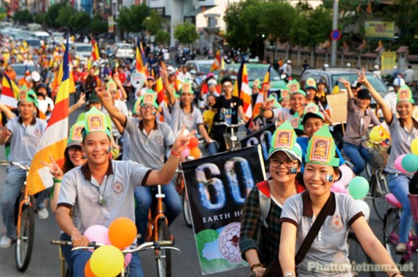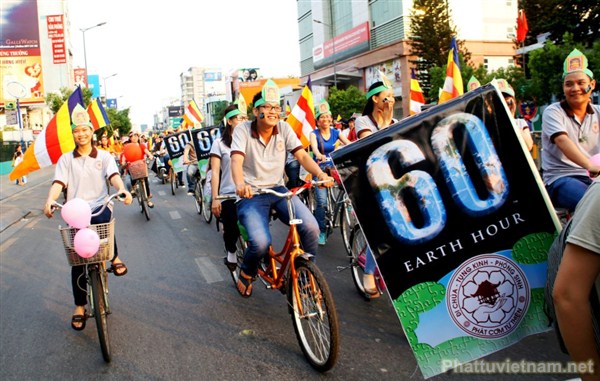 Bạn Minh Đạo – Trưởng ban Truyền thông của Hội đã hướng dẫn cho các thành viên thuê 20 chiếc xe đạp đôi, trang trí cờ phướn, khẩu hiệu và hình ảnh Logo Hội cùng với biểu trưng 60 + Giờ trái đất đạp xe đạp từ Chùa Ấn Quang về Chùa Phổ Quang theo lộ trình mà Ban tổ chức ấn định.