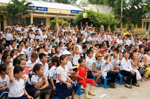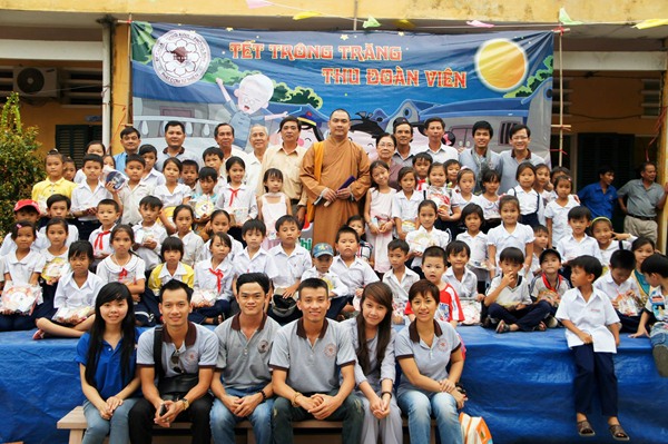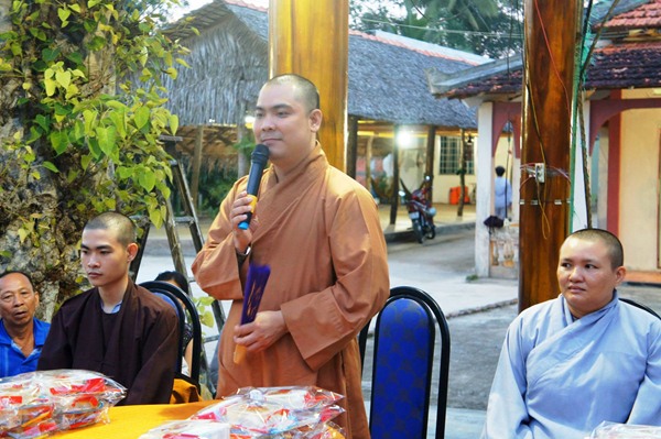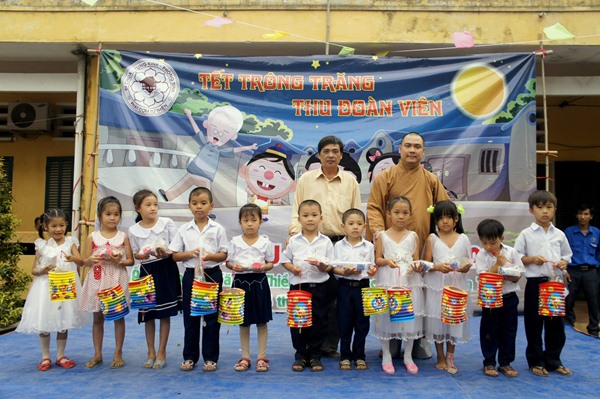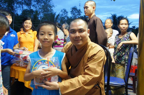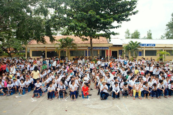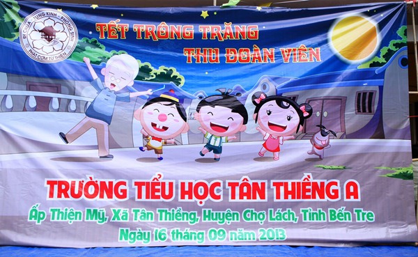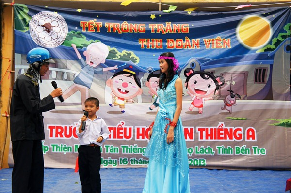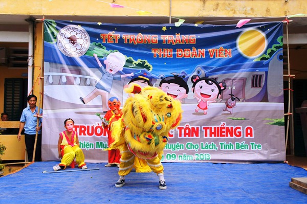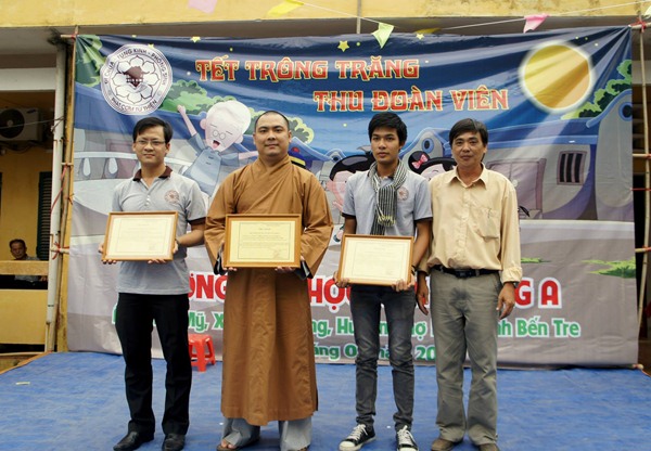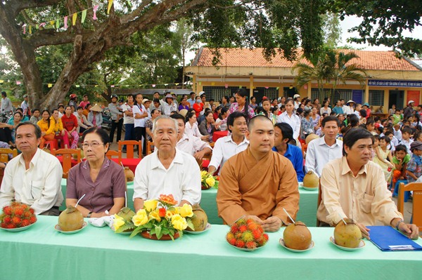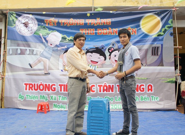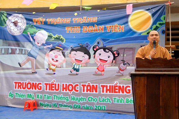 Đại đức Thích Lệ Minh (Phó Phân ban Thanh thiếu nhi Phật tử TW) – Trưởng ban tổ chức chương trình chia sẻ : Trường tiểu học Tân Thiềng A là một trong những ngôi trường gặp nhiều khó khăn của huyện Chợ Lách, cơ sở vật chất vẫn còn thiếu thốn. Vì thế, Hội 14 chữ đã vận động Công ty TNHH Nhựa Phước Thành (Quận 5, TP.HCM) hiến tặng 600 cái ghế ngồi chào cờ cho học sinh toàn trường.