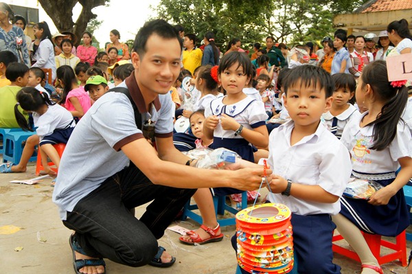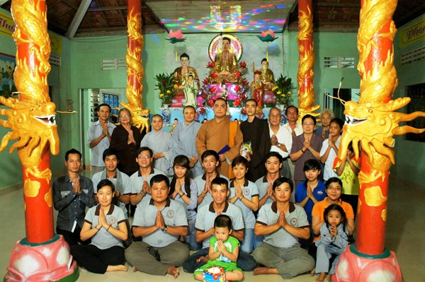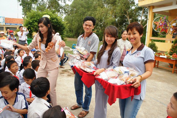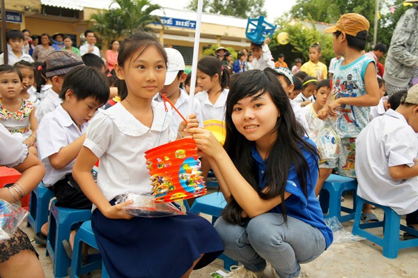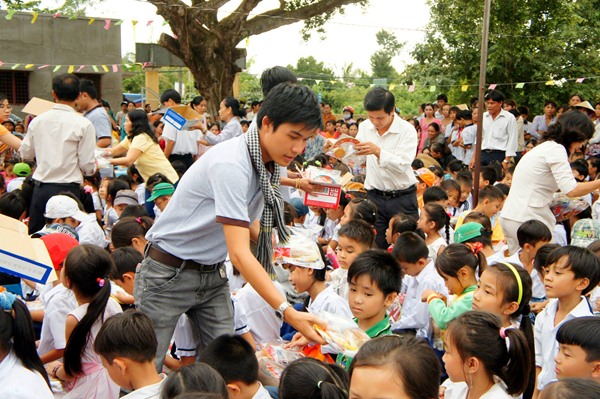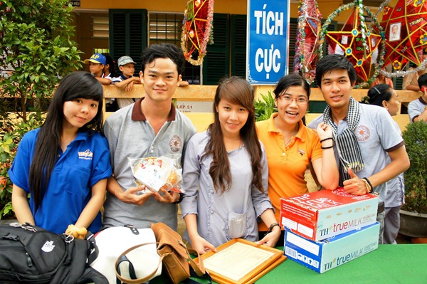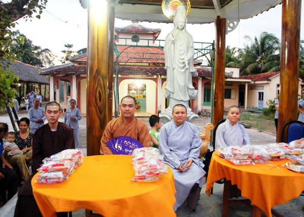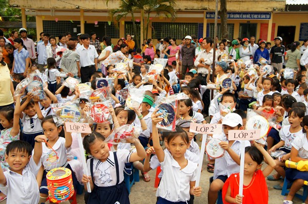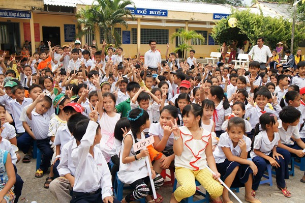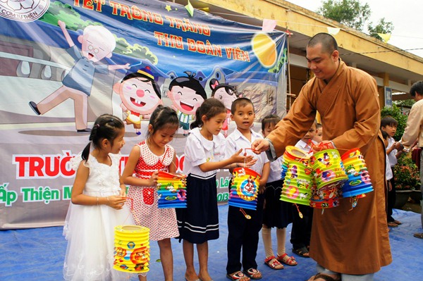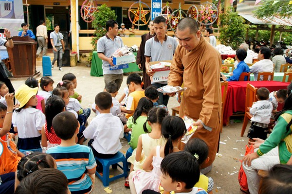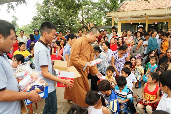 Đại đức Thích Lệ Minh (Phó Phân ban Thanh thiếu nhi Phật tử TW) – Trưởng ban tổ chức chương trình chia sẻ : Trường tiểu học Tân Thiềng A là một trong những ngôi trường gặp nhiều khó khăn của huyện Chợ Lách, cơ sở vật chất vẫn còn thiếu thốn. Vì thế, Hội 14 chữ đã vận động Công ty TNHH Nhựa Phước Thành (Quận 5, TP.HCM) hiến tặng 600 cái ghế ngồi chào cờ cho học sinh toàn trường.