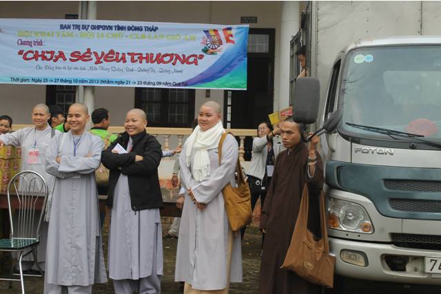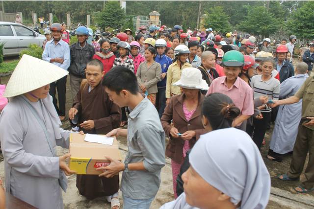 13h30 chiều, đoàn chúng tôi đặt chân xã Hải Thái, huyện Gio Linh, vùng đất đỏ ba gian với rừng cao su bạt ngàn cây lá, nhưng chúng đổ nát, hoang sơ đến tiêu điều. Đường đi khó khăn, nhỏ hẹp, đoàn phải đi bộ rất nhiều km mới đến điểm phát quà. Dừng chân trong hợp tác xã, chư tôn đức tăng ni và quý Phật tử đã gửi tặng bà con nơi đây 250 phần quà, không quên thăm hỏi, sẽ chia và an ủi bà con, thể hiện trọn vẹn tấm lòng bi mẫn của những người con Phật.