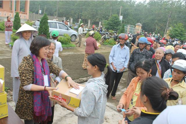 Đúng 15h00, đoàn rời xã Hải Thái và tiến về xã Vĩnh Long huyện Vĩnh Linh. Vừa đến nơi, bà con đã vân tập đông đủ, nhìn các cụ ông, cụ bà tóc trắng da nhăn, chống gậy đi nhận quà mà lòng nghẹn lại. Cuộc sống đã vất vả lao đao mà ông trời dường như bỏ mặc. Chỉ trong mấy tiếng đồng hồ chống chọi với bão lũ, mà nhiều gia đình phải vĩnh biệt nhau, nhiều hộ dân không có nhà ở, nhiều hoàn cảnh trắng tay vì tài sản bị phá tan.