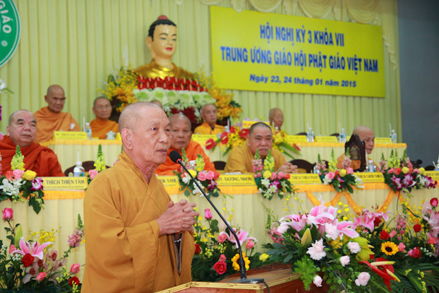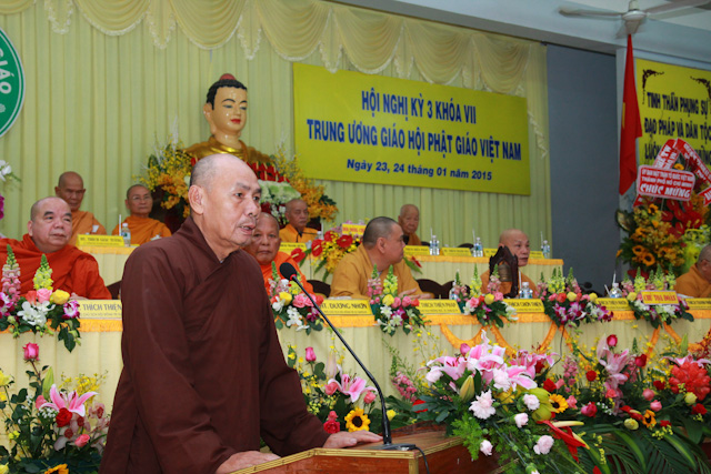 TT.Thích Viên Trí – Phó Ban Giáo dục Tăng,Ni TWGH phát biểu ý kiến của Ban về việc in ấn sách giáo khoa Phật giáo mới để phổ biến đến Tăng,Ni sinh các Học viện, trường cao đẳng, trung cấp các tỉnh, thành trong cả nước.