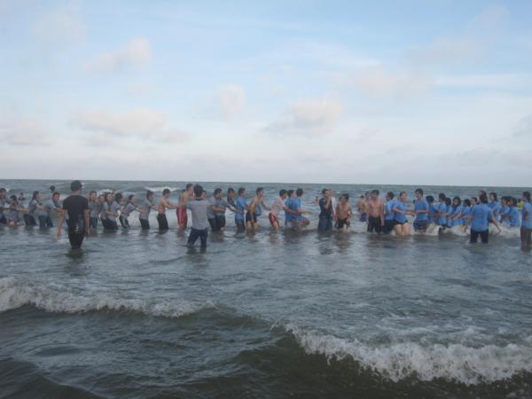 Sau các trò chơi vận động tập thể là màn đối mặt với đại dương bao la – cả đoàn xuống tắm biển. Dù không biết bơi nhưng phải công nhận mình lì và gan lắm. Mình thích biển, thích những con sóng cao, lội ra xa, mình nhảy sóng cùng mọi người. Trời ơi, lại còn bị uống nước nữa chứ, sợ nhưng thích quá, kaka. Cảm giác được tắm biển rất đã, khó tả lắm các bạn ạ. Hẹn gặp lại biển Vũng Tàu một ngày không xa nhé.