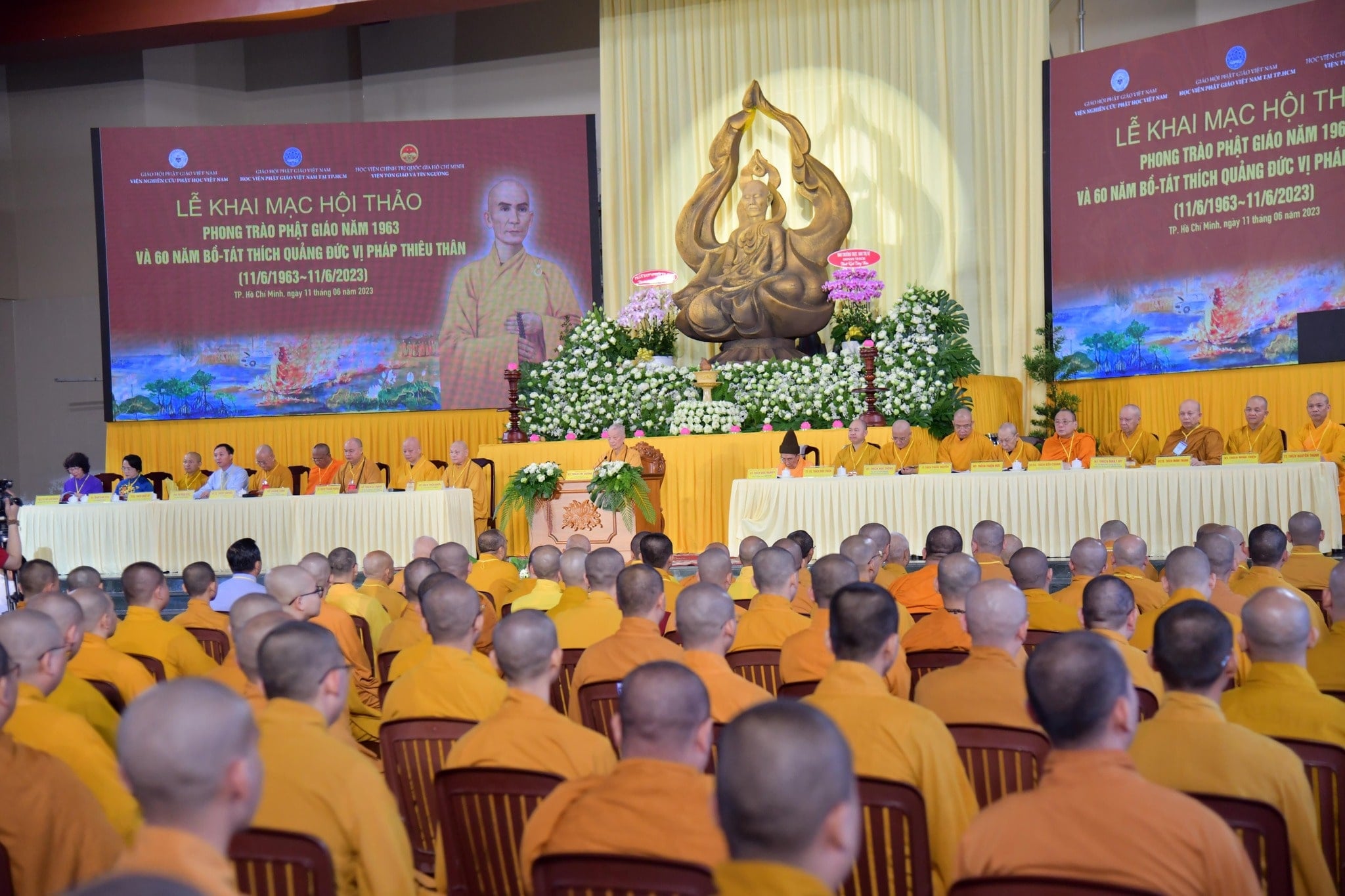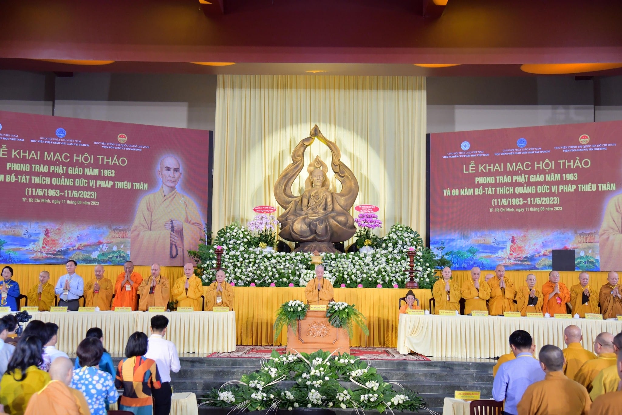 Sáng ngày 11/06/2023, tròn 60 năm ngày tự thiêu của Bồ tát Thích Quảng Đức, Học viện Phật giáo Việt Nam tại TP.HCM phối hợp cùng Viện Nghiên cứu Phật học Việt Nam và Viện Tôn giáo tín ngưỡng (Học viện Chính trị Quốc gia Hồ Chí Minh) long trọng tổ chức Hội thảo khoa học “Phong trào Phật giáo năm 1963 và 60 năm Bồ tát Thích Quảng Đức vị pháp thiêu thân”. Phiên khai mạc được tổ chức trọng thể tại đại giảng đường Minh Châu (cơ sở 2 Học viện).