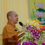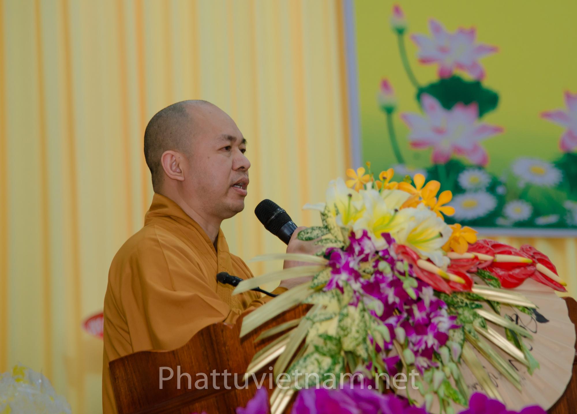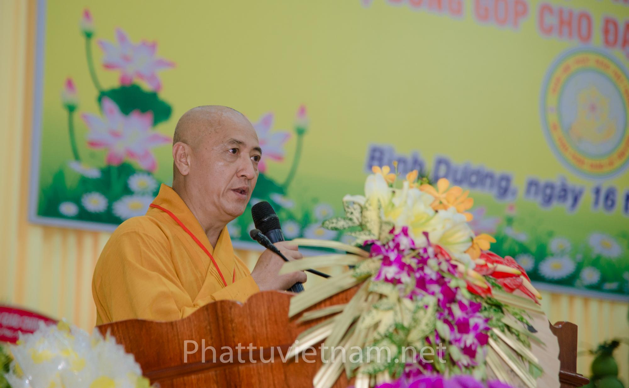 HT.Thích Huệ Thông, Trưởng ban Trị sự GHPGVN tỉnh Bình Dương, đồng Phó ban Tổ chức Hội thảo đã khái quát lịch sử hình thành, phát triển và nhấn mạnh đặc tính yêu nước, đặc tính duy trì giềng mối tu hành cổ truyền của GHPGCTVN.
