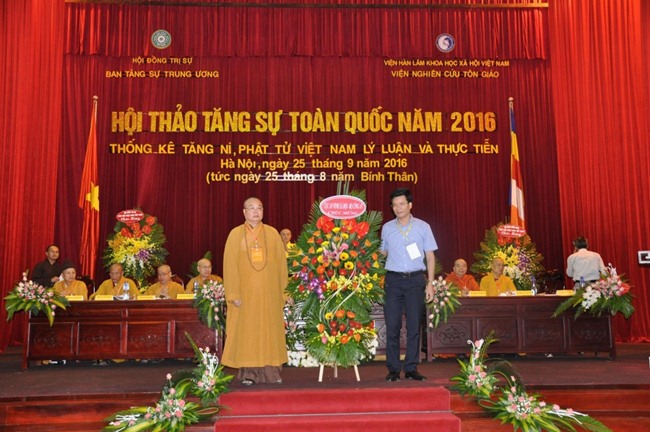 Tiếp theo Hội đồng Chứng minh, Hội đồng Trị sự, Ban, viện TƯ, quý Cơ quan lãnh đạo Ban Tôn giáo, cục An ninh tặng lẵng hoa chúc mừng hội thảo.
