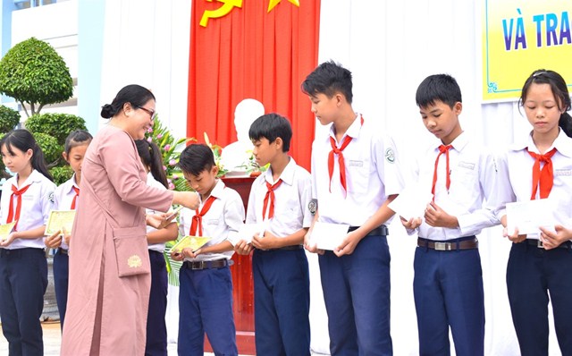 Tiếp theo, trong niềm vui của ngày Lễ tổng kết năm học 2016 – 2017, tại buổi Lễ, 100 em học sinh đã được HTT Phật Quang tặng giấy khen và một phần quà là 200.000 VNĐ (tiền mặt).