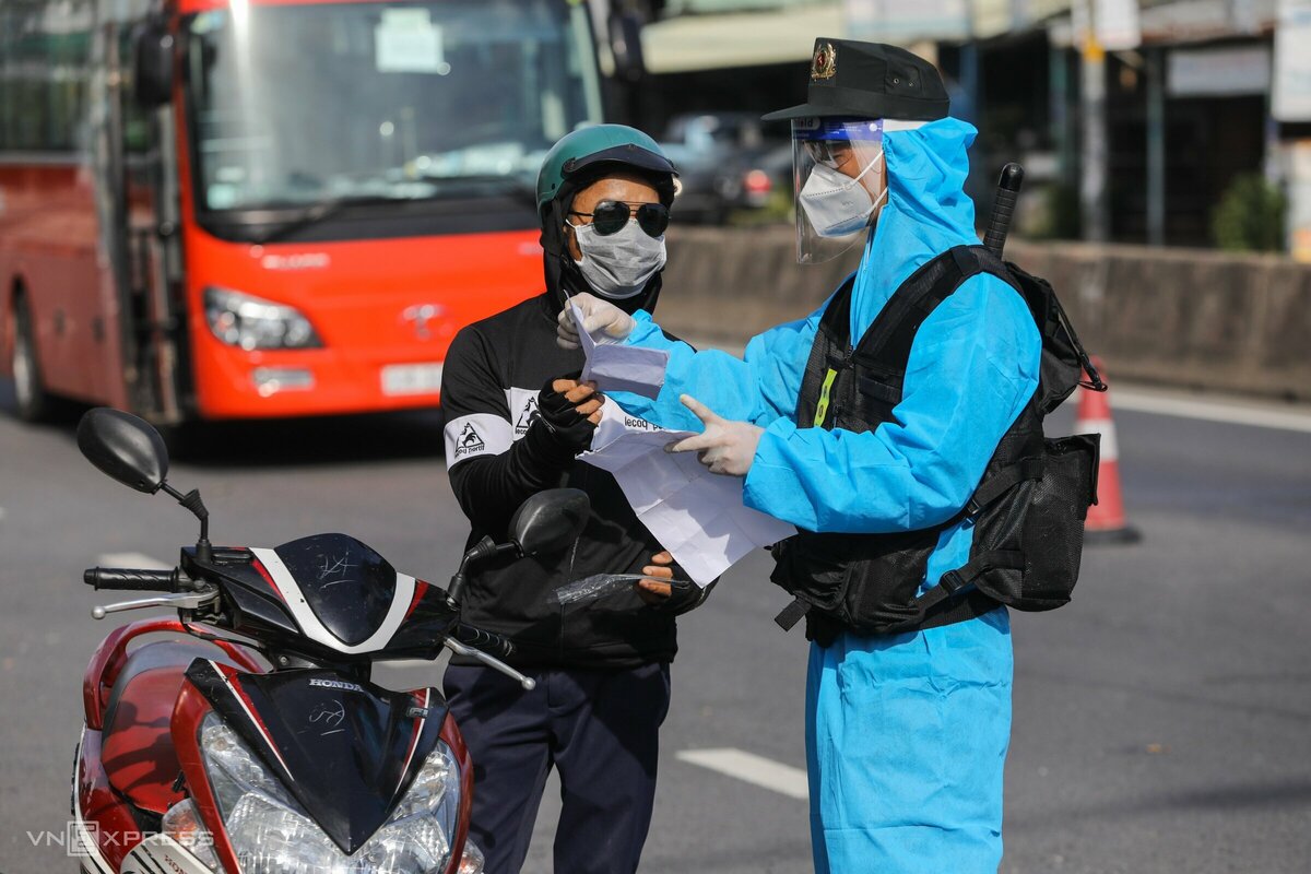Xe chở từng nhóm 24 chiến sĩ về các chốt kiểm soát để làm nhiệm vụ.Đoàn xe di chuyển về các chốt kiểm soát cửa ngõ TP HCM.Các chiến sĩ đeo mặt nạ giọt bắn để phòng chóng dịch trong quá trình tiếp khi làm nhiệm vụ trên đường.Ngoài ra, mỗi người mang theo túi y tế gồm thuốc: đau bao tử, tiêu chảy, sốt, đau đầu, băng gạc sơ cứu, áo mưa, đồ bảo hộ để đảm bảo công tác.Cảnh sát giao thông tại chốt cầu Vĩnh Bình, giáp tỉnh Bình Dương, hướng dẫn các chiến sĩ cơ động cách kiểm tra giấy tờ đi đường hợp lệ, khai báo quá trình di chuyển và tác phong khi làm nhiệm vụ.Cảnh sát cơ động mang độ bảo hộ, bao tay y tế đảm bảo phòng dịch kiểm tra giấy tờ của người đi xe máy.Sau hơn một giờ làm việc, binh nhất Hoàng Gia Thuận nhễ nhại mồ hôi khi lần đầu tiên mặc đồ bảo hộ y tế. “Ban đầu có một số khó khăn do chưa quen công việc mới nhưng tôi sẽ cố gắng hết sức để giúp TP HCM chống dịch”, chiến sĩ Thuận nói.